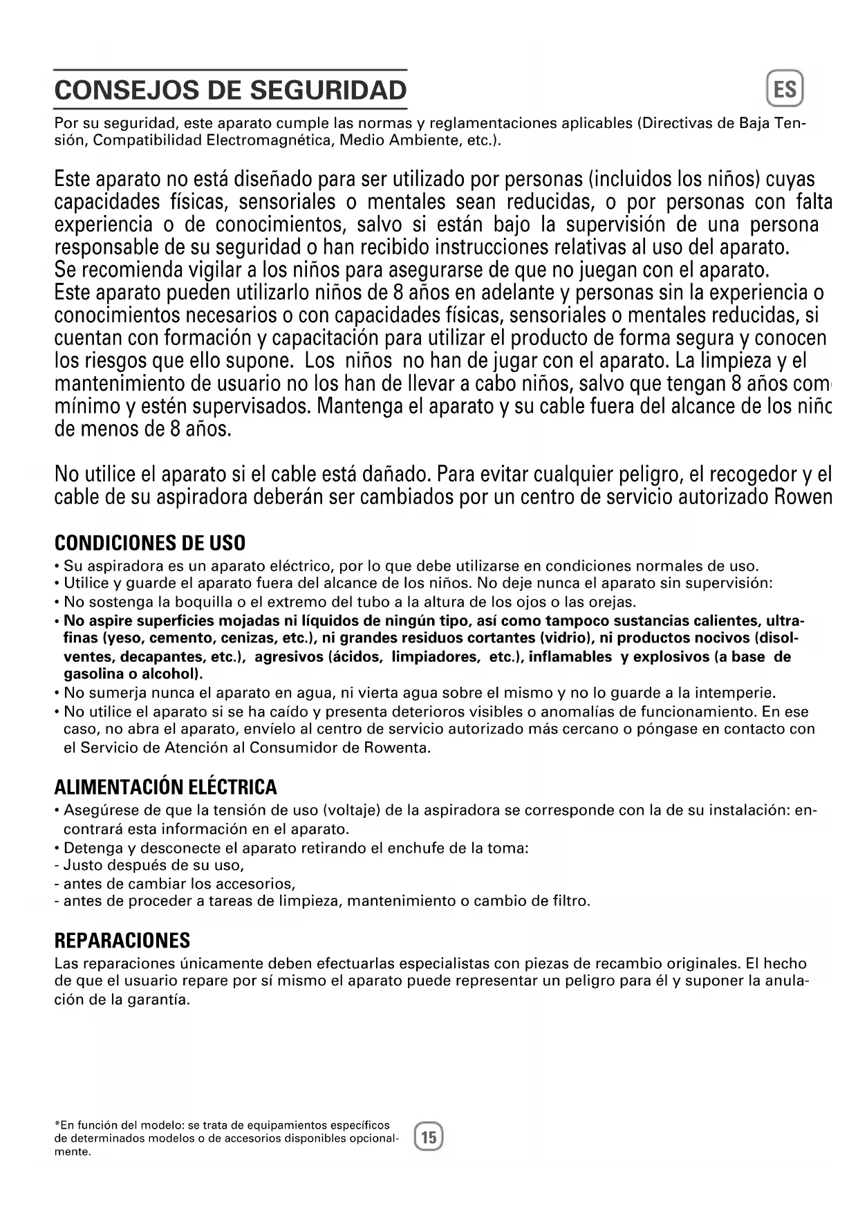 Por su seguridad, este aparato cumple las normas y reglamentaciones aplicables (Directivas de Baja Ten- sión, Compatibilidad Electromagnética, Medio Ambiente, etc.). Este aparato no está diseñado para ser utilizado por personas (incluidos los niños) cuyas capacidades físicas, sensoriales o mentales sean reducidas, o por personas con falta de experiencia o de conocimientos, salvo si están bajo la supervisión de una persona responsable de su seguridad o han recibido instrucciones relativas al uso del aparato. Se recomienda vigilar a los niños para asegurarse de que no juegan con el aparato. Este aparato pueden utilizarlo niños de 8 años en adelante y personas sin la experiencia o conocimientos necesarios o con capacidades físicas, sensoriales o mentales reducidas, si cuentan con formación y capacitación para utilizar el producto de forma segura y conocen los riesgos que ello supone. Los niños no han de jugar con el aparato. La limpieza y el mantenimiento de usuario no los han de llevar a cabo niños, salvo que tengan 8 años como mínimo y estén supervisados. Mantenga el aparato y su cable fuera del alcance de los niños de menos de 8 años. No utilice el aparato si el cable está dañado. Para evitar cualquier peligro, el recogedor y el cable de su aspiradora deberán ser cambiados por un centro de servicio autorizado Rowenta.