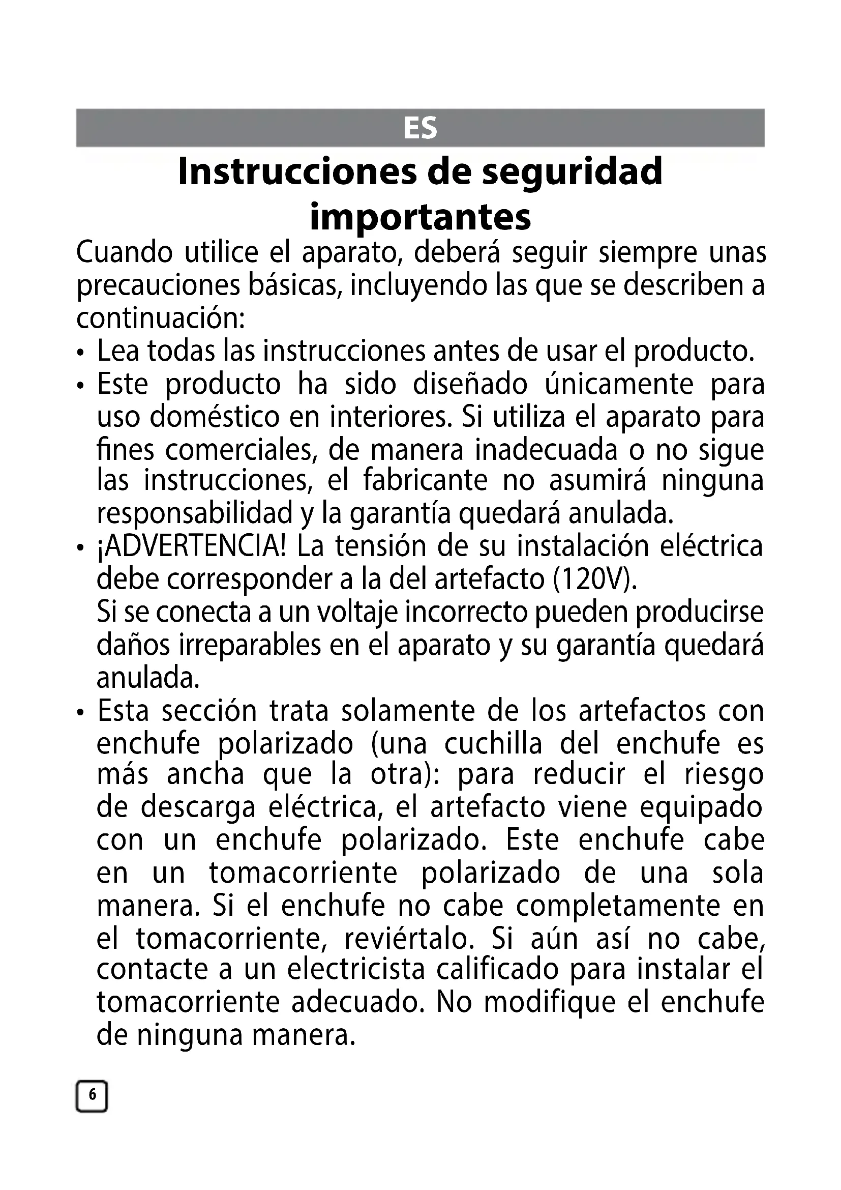 - Esta sección trata solamente de los artefactos con enchufe polarizado (una cuchilla del enchufe es más ancha que la otra): para reducir el riesgo de descarga eléctrica, el artefacto viene equipado con un enchufe polarizado. Este enchufe cabe en un tomacorriente polarizado de una sola manera. Si el enchufe no cabe completamente en el tomacorriente, reviértalo. Si aún así no cabe, contacte a un electricista calificado para instalar el tomacorriente adecuado. No modifique el enchufe de ninguna manera.7
