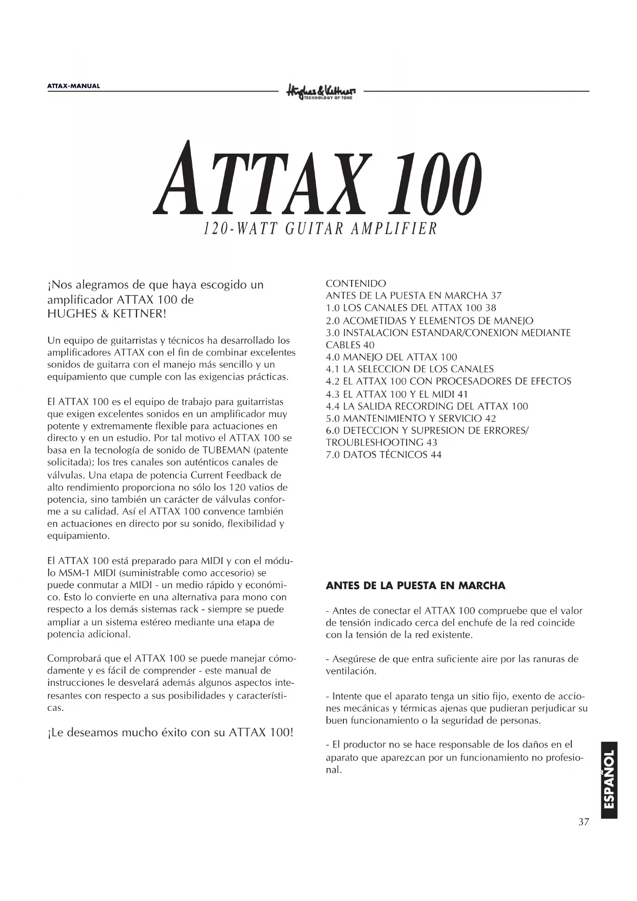 SEZIONE PREAMP Canali valvole CLEAN, CRUNCH & LEAD LOW INPUT: -10 dBV/ 1M Ohm HI INPUT: -20 dBV/ 1M Ohm FX-RETURN: -10dBV/ 47 k Ohm FX-SEND: 0 dBV/-10 dB/ 1 k Ohm REC.OUT: 0 dBV/ 800 Ohm SEZIONE FINALE Finale di potenza: solid-state CURRENT FEEDBACK Potenza di uscita: 90 watt su 8 ohm 120 watt su 4 ohm Risposta in Frequenza: 20 Hz - 50 kHz (su 4 ohm) Altoparlante: CELESTION RockDriver Vintage 12”, 8 ohm CARATTERISTICHE GENERALI Voltaggio: 230 V (Europa) 117 V (Nord America) 100 V (Giappone) Max. assorbimento : 200 VA (4 ohm) Fusibile: slo-blo 1000 mA (x modelli a 230 V) slo-blo 2000 mA (x modelli a 117 V) slo-blo 2500 mA (x modelli a 100 V) Dimensioni (L x A x P): COMBO: 560 x 500 x 285 mm TOP: 690 x 270 x 270 mm Peso: COMBO: 18 kg (circa), TOP: 16 kg (circa)37 ATTAX-MANUAL ESPAÑOL ¡Nos alegramos de que haya escogido un amplificador ATTAX 100 de HUGHES & KETTNER! Un equipo de guitarristas y técnicos ha desarrollado los amplificadores ATTAX con el fin de combinar excelentes sonidos de guitarra con el manejo más sencillo y un equipamiento que cumple con las exigencias prácticas. El ATTAX 100 es el equipo de trabajo para guitarristas que exigen excelentes sonidos en un amplificador muy potente y extremamente flexible para actuaciones en directo y en un estudio. Por tal motivo el ATTAX 100 se basa en la tecnología de sonido de TUBEMAN (patente solicitada); los tres canales son auténticos canales de válvulas. Una etapa de potencia Current Feedback de alto rendimiento proporciona no sólo los 120 vatios de potencia, sino también un carácter de válvulas confor- me a su calidad. Así el ATTAX 100 convence también en actuaciones en directo por su sonido, flexibilidad y equipamiento. El ATTAX 100 está preparado para MIDI y con el módu- lo MSM-1 MIDI (suministrable como accesorio) se puede conmutar a MIDI - un medio rápido y económi- co. Esto lo convierte en una alternativa para mono con respecto a los demás sistemas rack - siempre se puede ampliar a un sistema estéreo mediante una etapa de potencia adicional. Comprobará que el ATTAX 100 se puede manejar cómo- damente y es fácil de comprender - este manual de instrucciones le desvelará además algunos aspectos inte- resantes con respecto a sus posibilidades y característi- cas. ¡Le deseamos mucho éxito con su ATTAX 100! CONTENIDO