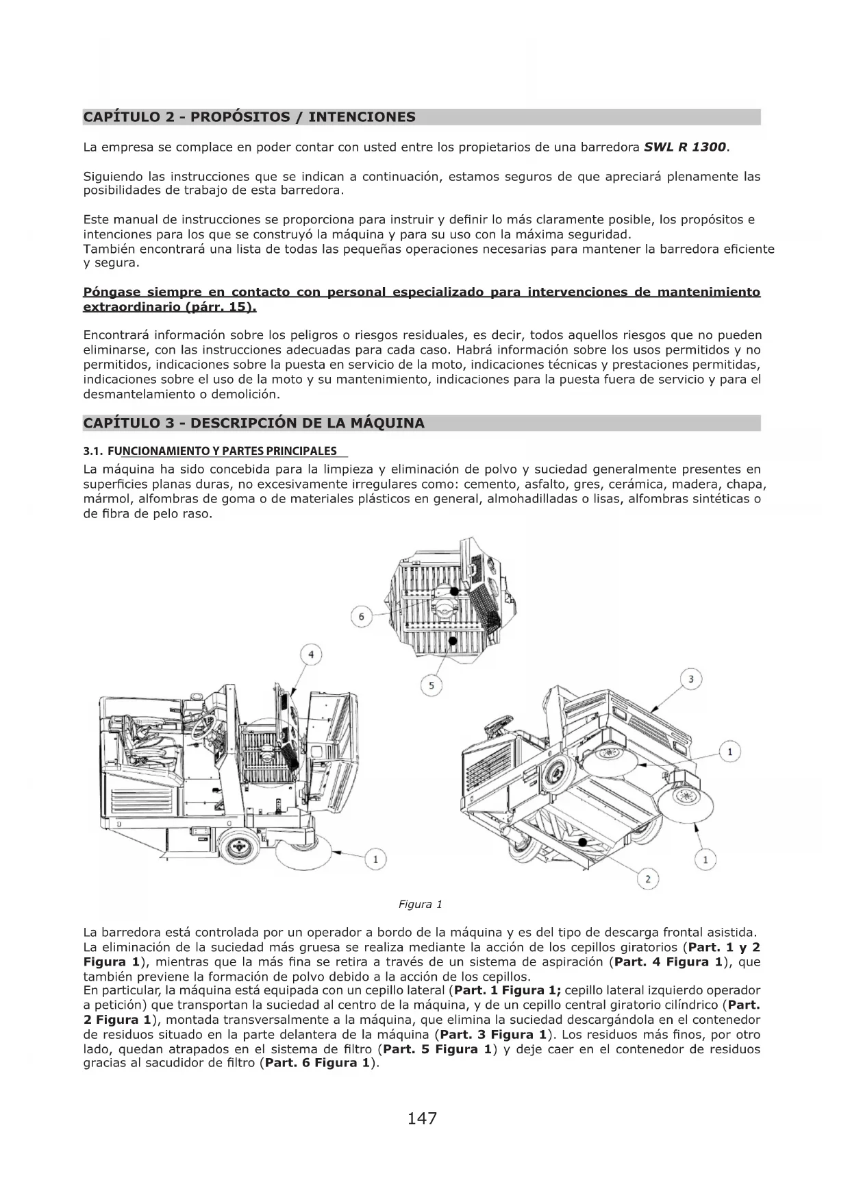 La empresa se complace en poder contar con usted entre los propietarios de una barredora SWL R 1300. Siguiendo las instrucciones que se indican a continuación, estamos seguros de que apreciará plenamente las posibilidades de trabajo de esta barredora. Este manual de instrucciones se proporciona para instruir y denir lo más claramente posible, los propósitos e intenciones para los que se construyó la máquina y para su uso con la máxima seguridad. También encontrará una lista de todas las pequeñas operaciones necesarias para mantener la barredora eciente y segura. Póngase siempre en contacto con personal especializado para intervenciones de mantenimiento extraordinario (párr. 15). Encontrará información sobre los peligros o riesgos residuales, es decir, todos aquellos riesgos que no pueden eliminarse, con las instrucciones adecuadas para cada caso. Habrá información sobre los usos permitidos y no permitidos, indicaciones sobre la puesta en servicio de la moto, indicaciones técnicas y prestaciones permitidas, indicaciones sobre el uso de la moto y su mantenimiento, indicaciones para la puesta fuera de servicio y para el desmantelamiento o demolición. CAPÍTULO 3 - DESCRIPCIÓN DE LA MÁQUINA