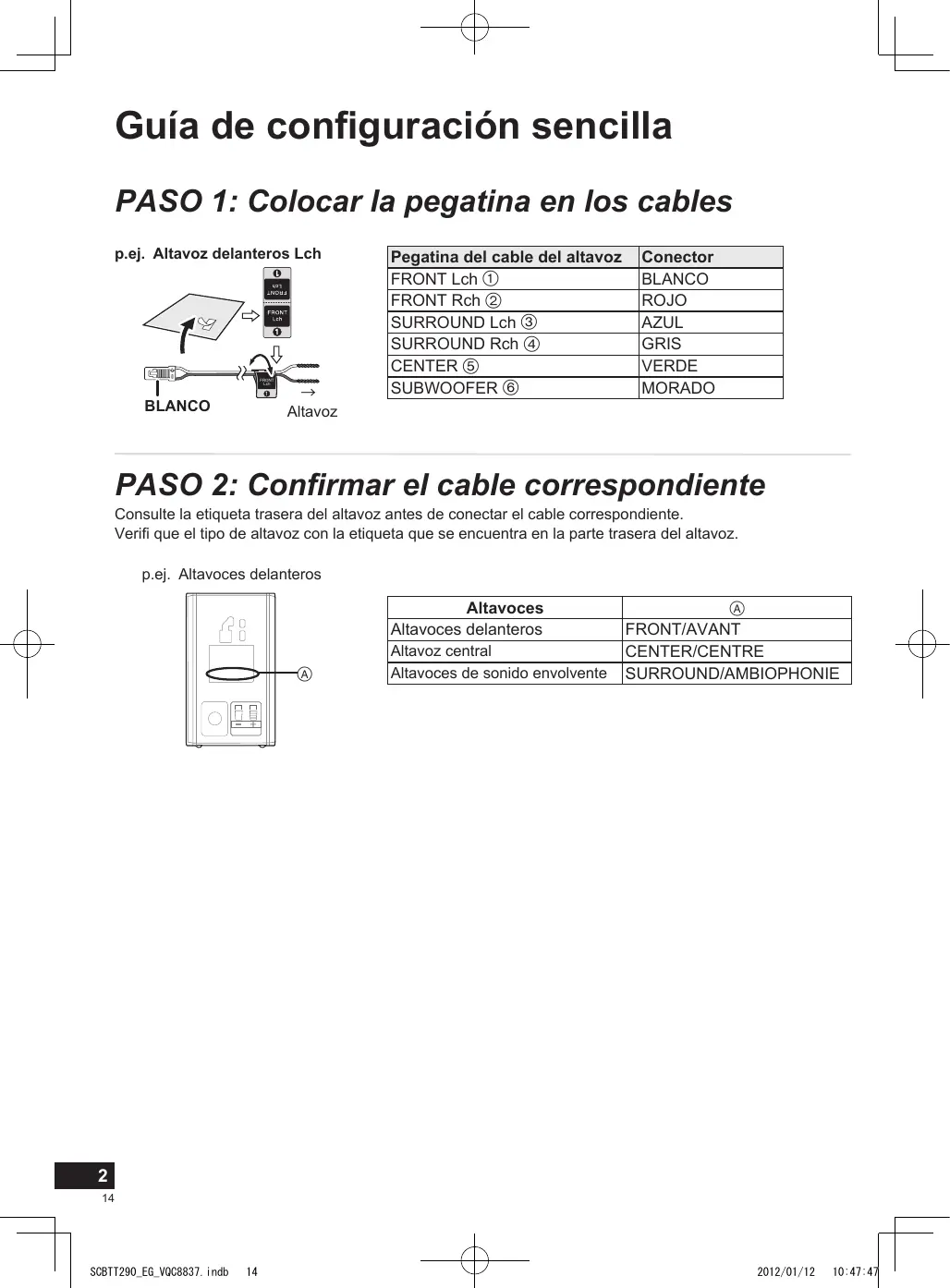 Guía de configuración sencilla Blu-ray Disc™ Sistema de sonido “Home Theater” (Teatro en casa) Guía de configuración sencilla PASO 1: Colocar la pegatina en los cables p.ej. Altavoz delanteros Lch FRONT Lch
