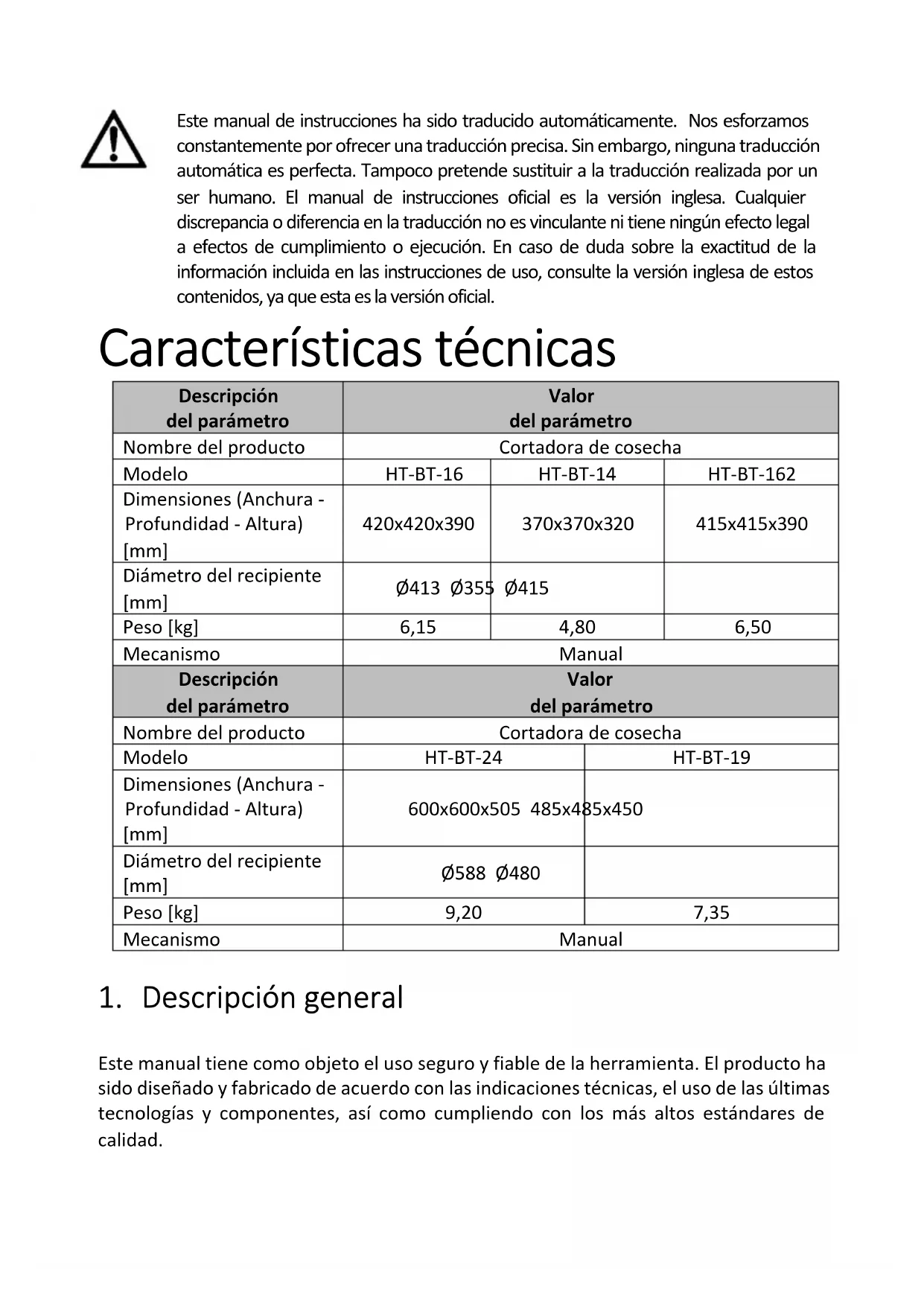 ¡ADVERTENCIA! Leer todas las advertencias de seguridad y todos los manuales e instrucciones. El incumplimiento de avisos e instrucciones puede causar lesiones graves o la muerte.El término "aparato" o "producto" en las advertencias y en la descripción del manual se refiere a: Cortadora de cosecha 2.1. Seguridad en el lugar de trabajo a) Mantenga la zona de trabajo ordenada y bien iluminada. El desorden o la mala iluminación pueden provocar accidentes. Sea previsor, mire lo que está haciendo y use el sentido común cuando use el dispositivo. b) Si encuentra algún daño o irregularidad en el funcionamiento del producto, apáguelo inmediatamente y comuníqueselo a una persona autorizada. c) Si tiene alguna duda sobre el funcionamiento del producto o si este está dañado, póngase en contacto con el servicio técnico del fabricante. d) Solo el servicio técnico del fabricante se puede encargar de la reparación del dispositivo. ¡No realizar las reparaciones por sí solo! e) En caso de producirse un fuego o un incendio, solo deben utilizarse extintores de polvo o de nieve carbónica (CO2) para extinguir el equipo con tensión eléctrica. f) No se permiten niños ni personas no autorizadas en el área de trabajo. (La falta de atención puede resultar en la pérdida de control de la unidad). g) Guardar este manual para futuras consultas. En caso de transmitir el equipo a otra persona, deberá entregarse también el manual de uso. h) Mantener los elementos de embalaje y las partes pequeñas de montaje fuera del alcance de los niños.