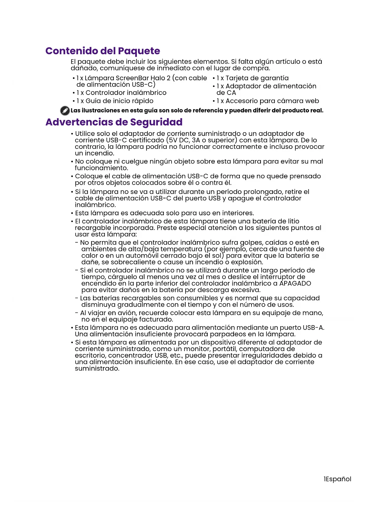 (0.15 in)1Español Contenido del Paquete El paquete debe incluir los siguientes elementos. Si falta algún artículo o está dañado, comuníquese de inmediato con el lugar de compra. Las ilustraciones en esta guía son solo de referencia y pueden diferir del producto real. Advertencias de Seguridad