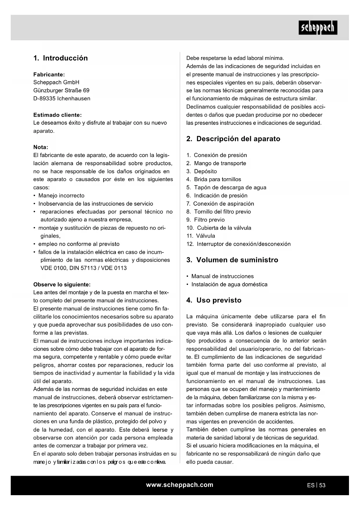 Fabricante: Scheppach GmbH Günzburger Straße 69 D-89335 Ichenhausen Estimado cliente: Le deseamos éxito y disfrute al trabajar con su nuevo aparato. Nota: El fabricante de este aparato, de acuerdo con la legis- lación alemana de responsabilidad sobre productos, no se hace responsable de los daños originados en este aparato o causados por éste en los siguientes casos: