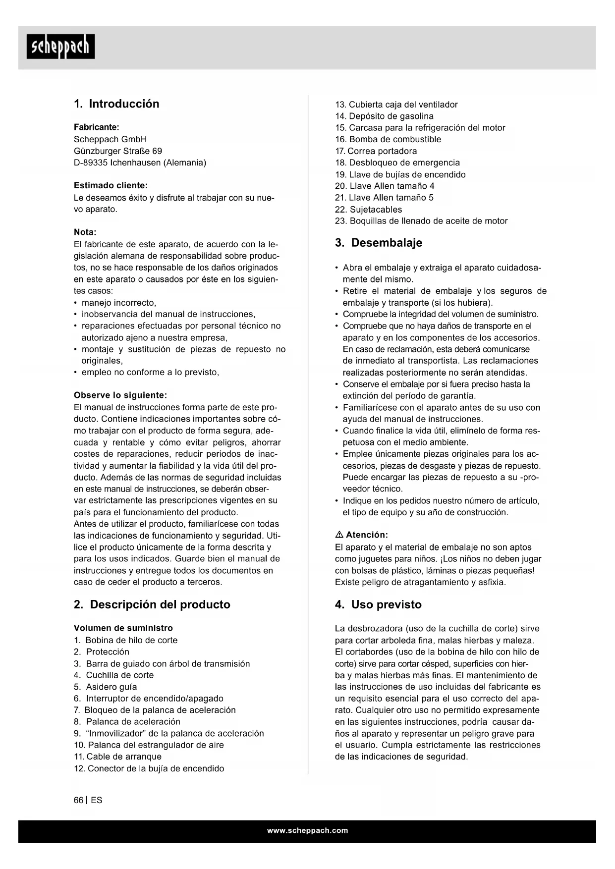 Fabricante: Scheppach GmbH Günzburger Straße 69 D-89335 Ichenhausen (Alemania) Estimado cliente: Le deseamos éxito y disfrute al trabajar con su nue- vo aparato. Nota: El fabricante de este aparato, de acuerdo con la le- gislación alemana de responsabilidad sobre produc- tos, no se hace responsable de los daños originados en este aparato o causados por éste en los siguien- tes casos: