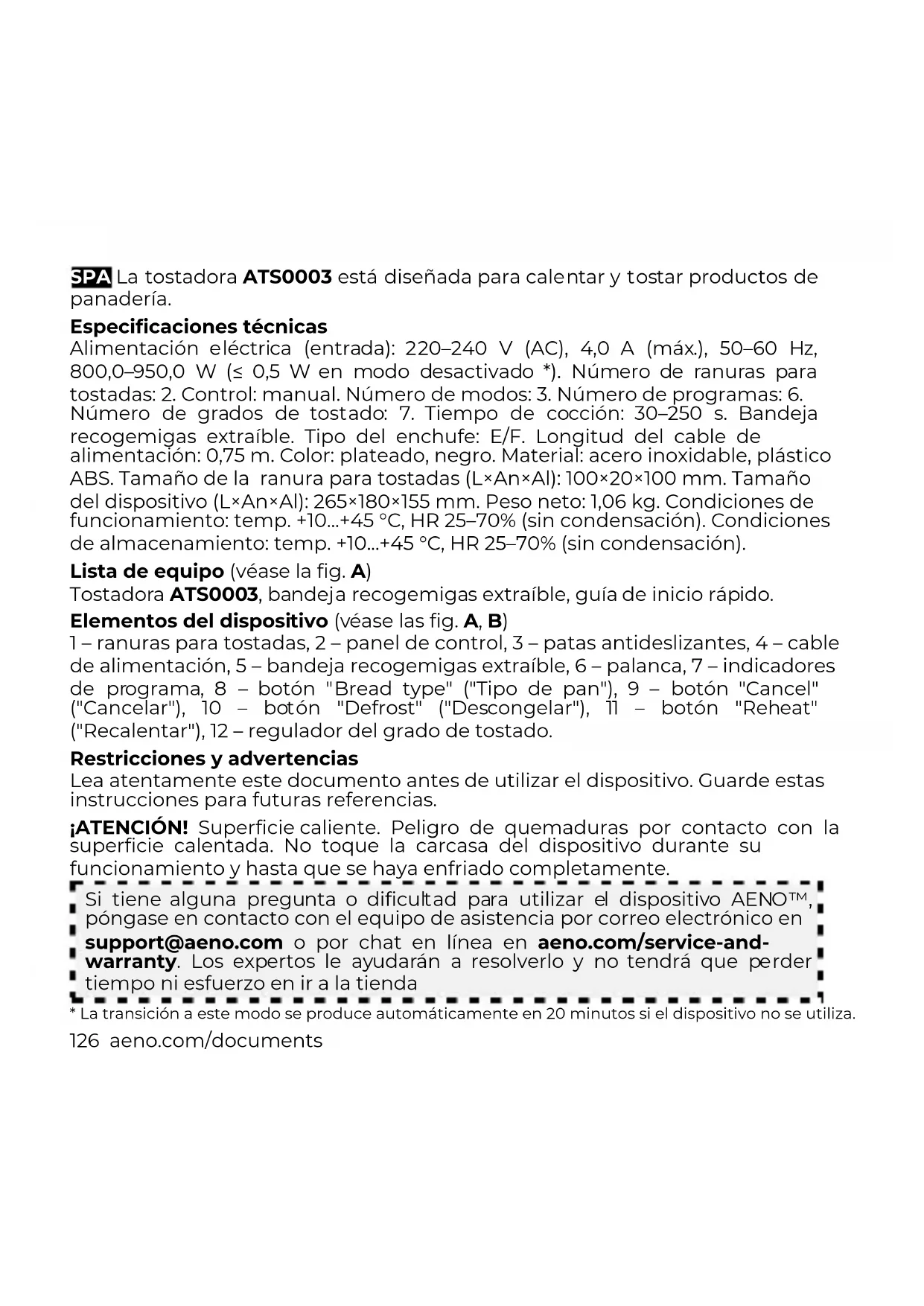 - La transición a este modo se produce automáticamente en 20 minutos si el dispositivo no se utiliza. Si tiene alguna pregunta o dificultad para utilizar el dispositivo AENO™, póngase en contacto con el equipo de asistencia por correo electrónico en support@aeno.com o por chat en línea en aeno.com/service-and- warranty. Los expertos le ayudarán a resolverlo y no tendrá que perder tiempo ni esfuerzo en ir a la tienda.aeno.com/documents 127 ¡ATENCIÓN! Instale el dispositivo a una distancia mínima de 1 metro de telas, artículos de decoración y otros objetos inflamables. ¡ATENCIÓN! No utilice objetos metálicos (cuchillos, tenedores, cucharas, etc.) para retirar las tostadas. Este dispositivo no está diseñado para que lo utilicen niños menores de 14 años ni personas con capacidades físicas, psíquicas o mentales reducidas, a menos que tengan experiencia y conocimientos suficientes sobre cómo utilizar el dispositivo y a menos que hayan sido supervisados por una persona responsable de su seguridad. El dispositivo está destinado exclusivamente al uso doméstico. No utilice el dispositivo al aire libre. El dispositivo no está diseñado para funcionar desde un temporizador externo o un sistema de control remoto. No permita que los niños jueguen con el dispositivo y los accesorios. No utilice un dispositivo dañado. No deje caer ni tire el dispositivo. Asegúrese de que la tensión y la frecuencia especificadas en la documentación técnica se corresponden con los parámetros de la fuente de alimentación. Manipule el dispositivo solo con las manos secas. Utilice la tostadora solamente para productos de panadería. No utilice pan engrasado o deformado. No deje el dispositivo en funcionamiento sin vigilancia. Desenchufe el dispositivo después de utilizarlo y antes de limpiarlo. Desconecte el dispositivo de la red eléctrica sujetándolo por el enchufe, no por el cable de alimentación. No sumerja el dispositivo ni sus componentes en agua ni los coloque bajo agua corriente. Asegúrese de que el cable de alimentación no esté retorcido, doblado, pellizcado o en contacto con objetos calientes y afilados o fuentes de calor. Mantenga el dispositivo fuera del alcance de los niños. No utilice detergentes químicamente agresivos, pastas abrasivas, productos que contengan ácidos y disolventes, ni esponjas metálicas para limpiar el dispositivo. Encontrará una descripción detallada del dispositivo, sus modos y funciones en el manual de instrucciones completo disponible en aeno.com/ documents. Elementos de control del dispositivo (véase la fig. B) Para seleccionar un modo/programa, pulse el botón correspondiente. Gire el regulador para seleccionar el grado de tostado.128 aeno.com/documents Elemento de control