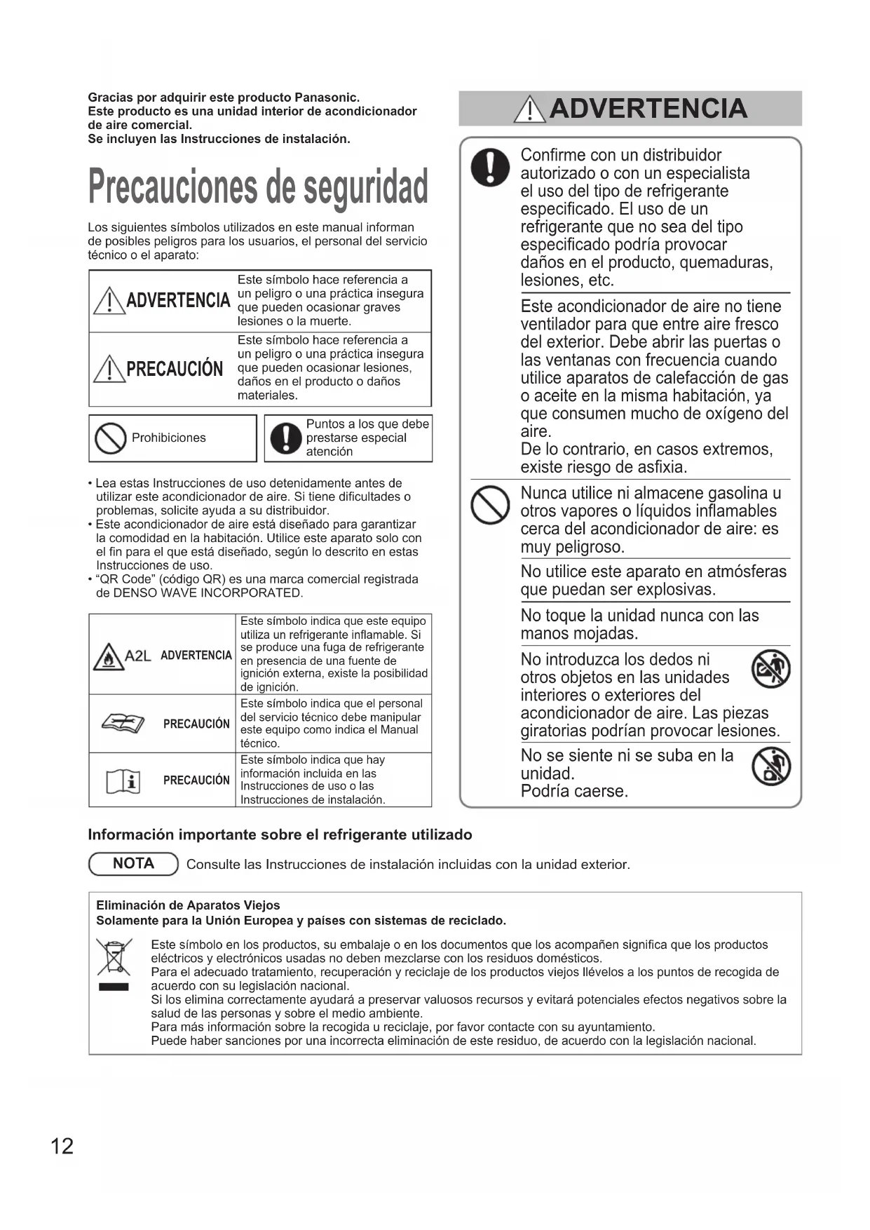 Unité extérieure La bobine interne et les autres composants de l’unité extérieure doivent être nettoyés régulièrement.• Consultez votre revendeur ou un centre de services.Sortie d’airEntrée d’airEssuyez avec un chion doux.(En cas de saleté tenace, utilisez un chion imbibé d’eau tiède.) Mécanisme de fonctionnement AVIS Ce climatiseur intègre un produit biocide.Les radicaux libres générés par un dispositif intégré au climatiseur ont la capacité de freiner les polluants, tels que certains types de bactéries, virus ou moisissures.Substances actives : radicaux libres générés sur place par l’air ambiant ou l’eauUtilisation : cette fonction du dispositif peut être activée/désactivée par le bouton de l’icône « nanoe X » ou par les paramètres de la télécommande s’il n’y a pas de bouton de l’icône « nanoe X ». Veuillez vous reporter à la section « Méthode d’utilisation » pour en savoir plus. Scannez le QR code sur la page de garde et lisez les instructions détaillées sur l’utilisation. 00_360661_all.indb 1100_360661_all.indb 11 2024/10/07 17:19:292024/10/07 17:19:2912 Gracias por adquirir este producto Panasonic.Este producto es una unidad interior de acondicionador de aire comercial.Se incluyen las Instrucciones de instalación. Precauciones de seguridad Los siguientes símbolos utilizados en este manual informan de posibles peligros para los usuarios, el personal del servicio técnico o el aparato: ADVERTENCIA Este símbolo hace referencia a un peligro o una práctica insegura que pueden ocasionar graves lesiones o la muerte. PRECAUCIÓN Este símbolo hace referencia a un peligro o una práctica insegura que pueden ocasionar lesiones, daños en el producto o daños materiales.ProhibicionesPuntos a los que debe prestarse especial atención• Lea estas Instrucciones de uso detenidamente antes de utilizar este acondicionador de aire. Si tiene dicultades o problemas, solicite ayuda a su distribuidor.• Este acondicionador de aire está diseñado para garantizar la comodidad en la habitación. Utilice este aparato solo con el n para el que está diseñado, según lo descrito en estas Instrucciones de uso.• “QR Code” (código QR) es una marca comercial registrada de DENSO WAVE INCORPORATED. ADVERTENCIA Información importante sobre el refrigerante utilizado NOTA Consulte las Instrucciones de instalación incluidas con la unidad exterior.Eliminación de Aparatos Viejos Solamente para la Unión Europea y países con sistemas de reciclado.Este símbolo en los productos, su embalaje o en los documentos que los acompañen signica que los productos eléctricos y electrónicos usadas no deben mezclarse con los residuos domésticos.Para el adecuado tratamiento, recuperación y reciclaje de los productos viejos llévelos a los puntos de recogida de acuerdo con su legislación nacional. Si los elimina correctamente ayudará a preservar valuosos recursos y evitará potenciales efectos negativos sobre la salud de las personas y sobre el medio ambiente.Para más información sobre la recogida u reciclaje, por favor contacte con su ayuntamiento.Puede haber sanciones por una incorrecta eliminación de este residuo, de acuerdo con la legislación nacional.ADVERTENCIAEste símbolo indica que este equipo utiliza un refrigerante inflamable. Si se produce una fuga de refrigerante en presencia de una fuente de ignición externa, existe la posibilidad de ignición.PRECAUCIÓNEste símbolo indica que el personal del servicio técnico debe manipular este equipo como indica el Manual técnico.PRECAUCIÓNEste símbolo indica que hay información incluida en las Instrucciones de uso o las Instrucciones de instalación. Conrme con un distribuidor autorizado o con un especialista el uso del tipo de refrigerante especicado. El uso de un refrigerante que no sea del tipo especicado podría provocar daños en el producto, quemaduras, lesiones, etc. Este acondicionador de aire no tiene ventilador para que entre aire fresco del exterior. Debe abrir las puertas o las ventanas con frecuencia cuando utilice aparatos de calefacción de gas o aceite en la misma habitación, ya que consumen mucho de oxígeno del aire. De lo contrario, en casos extremos, existe riesgo de asxia. Nunca utilice ni almacene gasolina u otros vapores o líquidos inamables cerca del acondicionador de aire: es muy peligroso. No utilice este aparato en atmósferas que puedan ser explosivas. No toque la unidad nunca con las manos mojadas. No introduzca los dedos ni otros objetos en las unidades interiores o exteriores del acondicionador de aire. Las piezas giratorias podrían provocar lesiones. No se siente ni se suba en la unidad. Podría caerse. 00_360661_all.indb 1200_360661_all.indb 12 2024/10/07 17:19:292024/10/07 17:19:2913 ESPAÑOL Si el refrigerante entra en contacto con una llama, produce gases tóxicos. Por razones de seguridad, asegúrese de apagar el acondicionador de aire y también de desconectar la alimentación antes de una limpieza o una reparación. Desenchufe el cable de alimentación de la toma de corriente, apague el disyuntor o apague el sistema de desconexión de la alimentación para aislar el acondicionador de aire de la alimentación eléctrica principal en caso de emergencia. Deseche el aparato de acuerdo con la legislación nacional y local. Este producto no se puede modicar ni desmontar en ningún caso. La unidad modicada o desmontada podría provocar incendios, descargas eléctricas o lesiones. Los usuarios no pueden limpiar el interior de las unidades interiores ni el de las unidades exteriores. La limpieza debe realizarla un especialista o un distribuidor autorizados. Si el aparato falla, no lo repare usted mismo. Póngase en contacto con el distribuidor de ventas o con el distribuidor de servicios técnicos si necesita una reparación o eliminar el producto. Cada unidad debe utilizar en exclusiva una toma de corriente. En esta línea exclusiva debe haber un sis