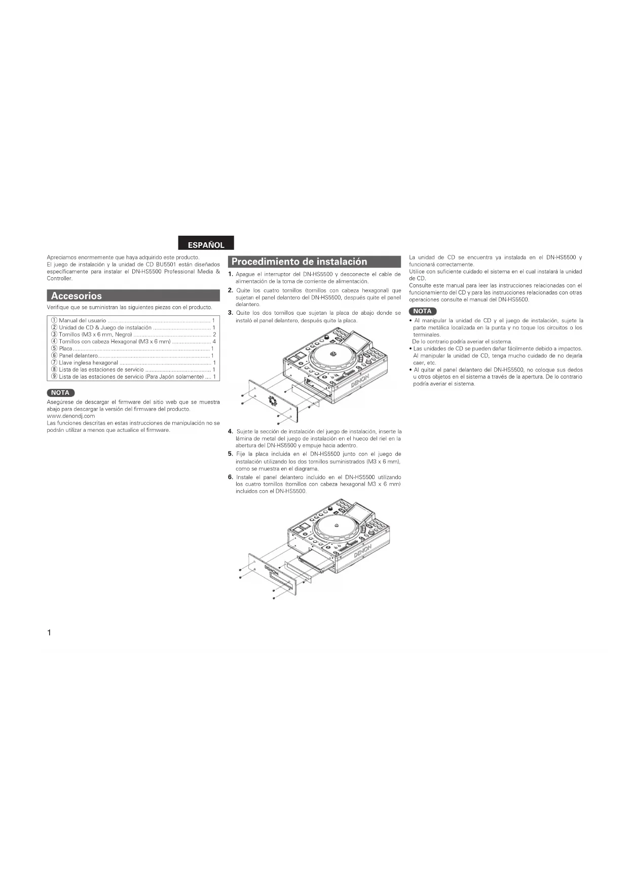 los cuatro tornillos (tornillos con cabeza hexagonal M3 x 6 mm) incluidos con el DN-HS5500. La unidad de CD se encuentra ya instalada en el DN-HS5500 y funcionará correctamente. Utilice con suficiente cuidado el sistema en el cual instalará la unidad de CD. Consulte este manual para leer las instrucciones relacionadas con el funcionamiento del CD y para las instrucciones relacionadas con otras operaciones consulte el manual del DN-HS5500. NOTA