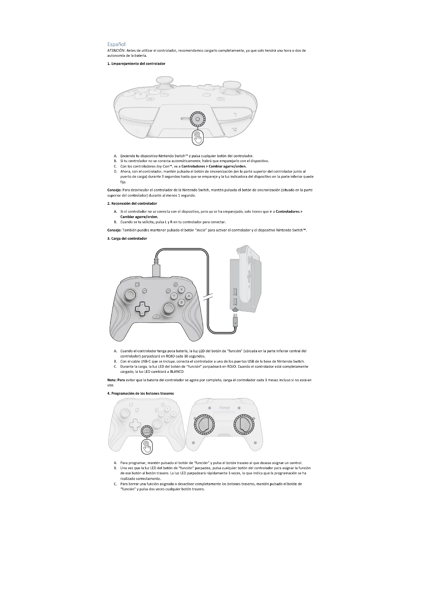 A. Cuando el control tenga la batería baja, la luz LED del botón “función” (situada en la parte inferior central del control) parpadeará en ROJO cada 30 segundos. B. Con el cable USB-C incluido, conecta el control a uno de los puertos USB en la base de la Nintendo Switch. C. Mientras se carga, la luz LED del botón de “función” parpadeará en ROJO. Cuando el control esté totalmente cargado, la LED se volverá BLANCA. Nota: Para evitar que la batería del control se agote por completo, carga el control cada tres meses incluso si no está en uso.