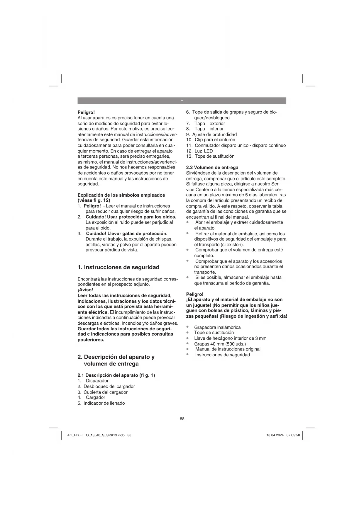 nes de las manos y los brazos si el aparato se utiliza durante un largo periodo tiempo, no se sujeta del modo correcto o si no se realiza un mantenimiento adecuado. Peligro! Esta herramienta eléctrica genera un campo electromagnético durante su funcionamiento. En determinadas circunstancias, este campo podrá afectar a los posibles implantes médicos activos o pasivos. Para reducir el peligro de lesiones graves o incluso mortales, recomendamos a las personas que lleven este tipo de implantes que consulten a su médico y al fabricante del implante antes de operar la máquina. Anl_FIXETTO_18_40_S_SPK13.indb 89Anl_FIXETTO_18_40_S_SPK13.indb 89 18.04.2024 07:05:5818.04.2024 07:05:58E
