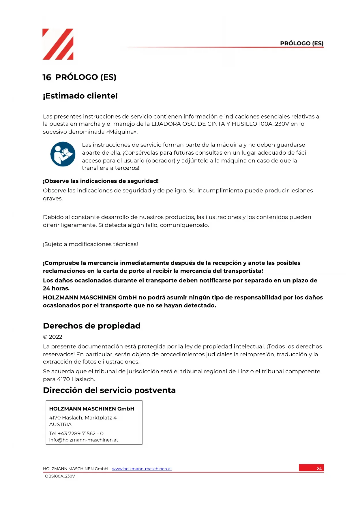 Las instrucciones de servicio forman parte de la máquina y no deben guardarse aparte de ella. ¡Consérvelas para futuras consultas en un lugar adecuado de fácil acceso para el usuario (operador) y adjúntelo a la máquina en caso de que la transfiera a terceros! ¡Observe las indicaciones de seguridad! Observe las indicaciones de seguridad y de peligro. Su incumplimiento puede producir lesiones graves. Debido al constante desarrollo de nuestros productos, las ilustraciones y los contenidos pueden diferir ligeramente. Si detecta algún fallo, comuníquenoslo. ¡Sujeto a modificaciones técnicas! ¡Compruebe la mercancía inmediatamente después de la recepción y anote las posibles reclamaciones en la carta de porte al recibir la mercancía del transportista! Los daños ocasionados durante el transporte deben notificarse por separado en un plazo de 24 horas. HOLZMANN MASCHINEN GmbH no podrá asumir ningún tipo de responsabilidad por los daños ocasionados por el transporte que no se hayan detectado. Derechos de propiedad © 2022 La presente documentación está protegida por la ley de propiedad intelectual. ¡Todos los derechos reservados! En particular, serán objeto de procedimientos judiciales la reimpresión, traducción y la extracción de fotos e ilustraciones. Se acuerda que el tribunal de jurisdicción será el tribunal regional de Linz o el tribunal competente para 4170 Haslach. Dirección del servicio postventa