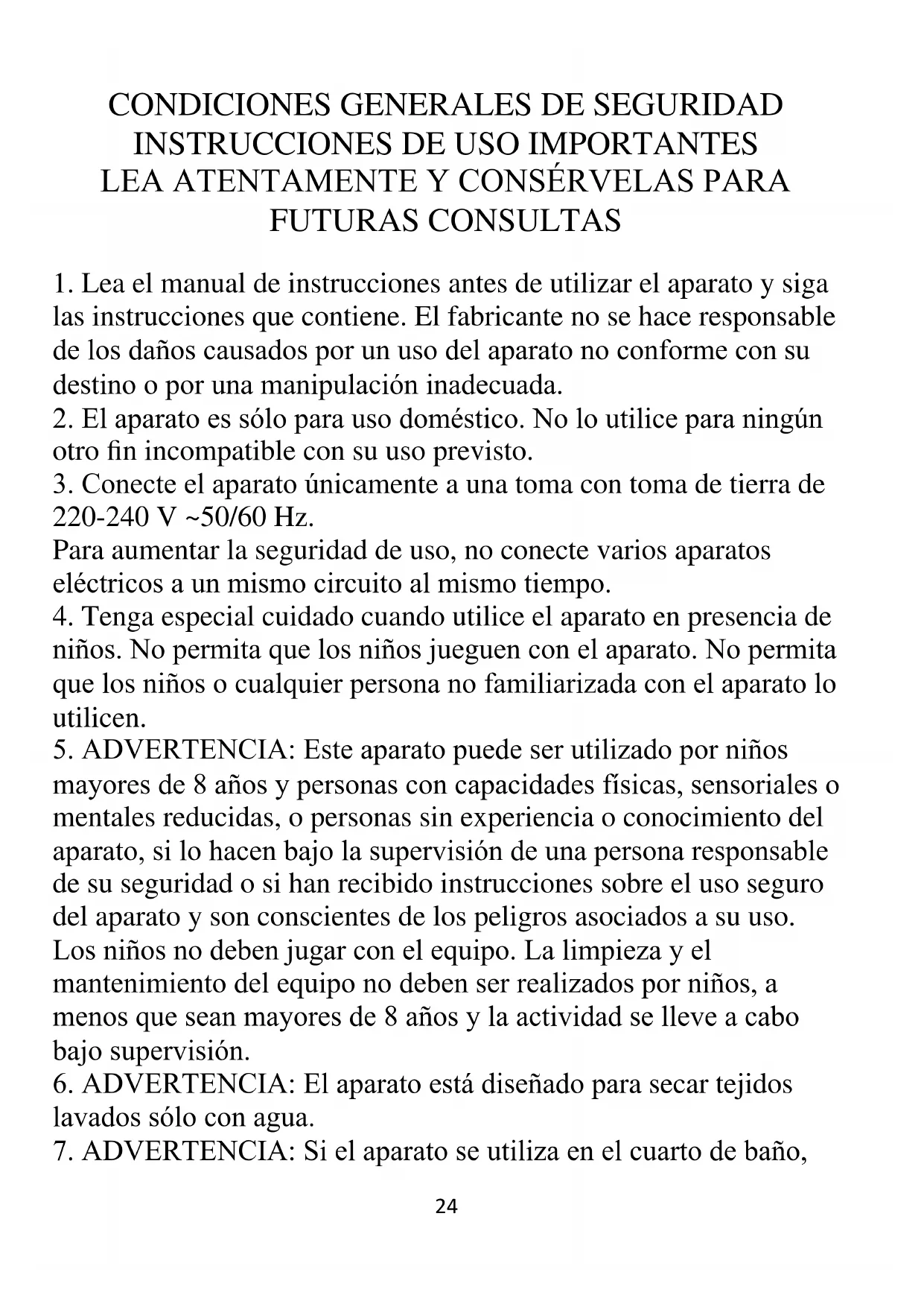 6. ADVERTENCIA: El aparato está diseñado para secar tejidos