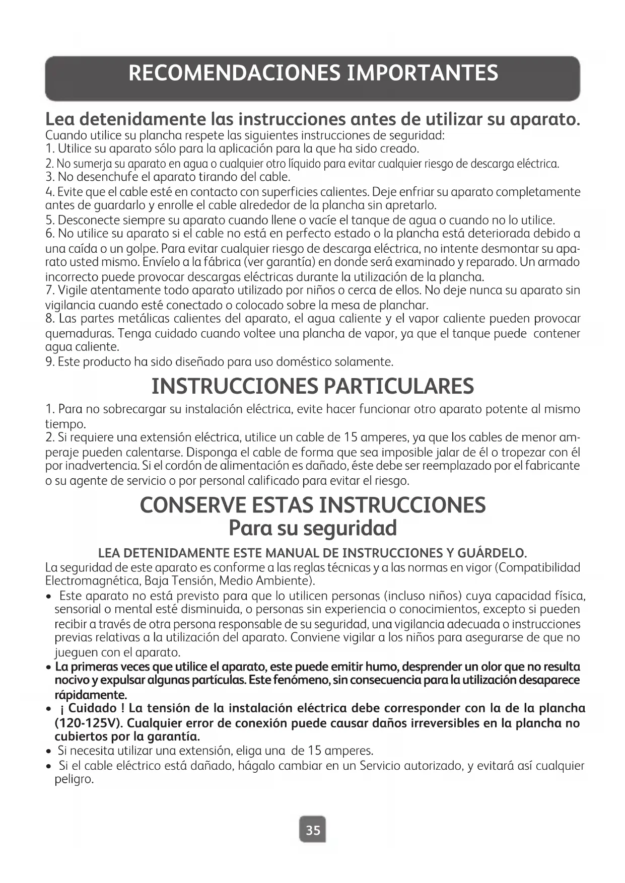 RECOMENDACIONES IMPORTANTES Lea detenidamente las instrucciones antes de utilizar su aparato. Cuando utilice su plancha respete las siguientes instrucciones de seguridad: