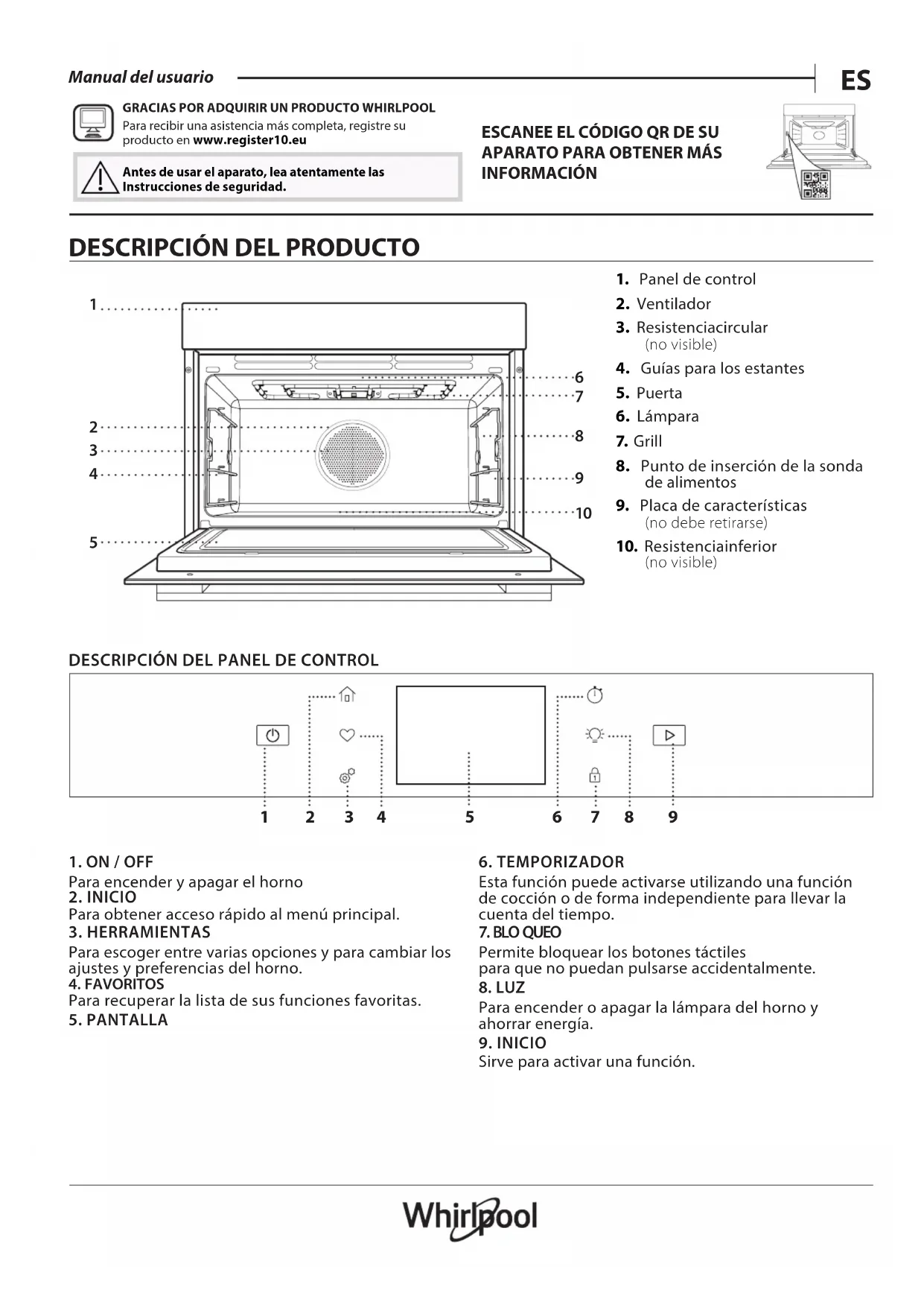 Problema Posible causa Solución El horno no funciona. Corte de suministro. Desconexión de la red eléctrica. Compruebe que haya corriente eléctrica en la red y que el horno esté enchufado a la toma de electricidad. Apague el horno y vuelva a encenderlo para comprobar si se ha solucionado el problema. El horno hace ruido, incluso cuando está apagado. Ventilador de refrigeración activado. Abra la puerta o espere a que finalice el proceso de enfriamiento. En la pantalla aparecerá la letra «F» seguida de un número. Fallo del software. Póngase en contacto con el Servicio Postventa más cercano e indique el número que aparece detrás de la letra «F». Pulse , toque sobre «Info» y seleccione “Restablecer ajustes de fábrica”. Se borrarán todos los ajustes guardados. La pantalla muestra F3E3. La sonda no está bien conectada o puede que no esté haciendo contacto correctamente. En primer lugar, comprueba la sonda; si se introduce correctamente pero persiste el error, llame al Centro de Servicio Postventa. Notifique el error que aparece en la pantalla. El horno no se calienta. Cuando «DEMO» está establecido en «On» , todos los mandos están activos y los menús disponibles, pero el horno no se calienta. DEMO aparecerá en la pantalla cada 60 segundos. Acceda a «DEMO» desde «AJUSTES» y seleccione «Off». 400020023888PT Manual do utilizador OBRIGADO POR TER ADQUIRIDO UM PRODUTO WHIRLPOOLPara receber uma assistência mais completa, registe o seu produto em www.register10.eu PARA OBTER MAIS INFORMAÇÕES, LEIA O CÓDIGO QR NO SEU APARELHO Leia as instruções de segurança com atenção antes de usar o aparelho.