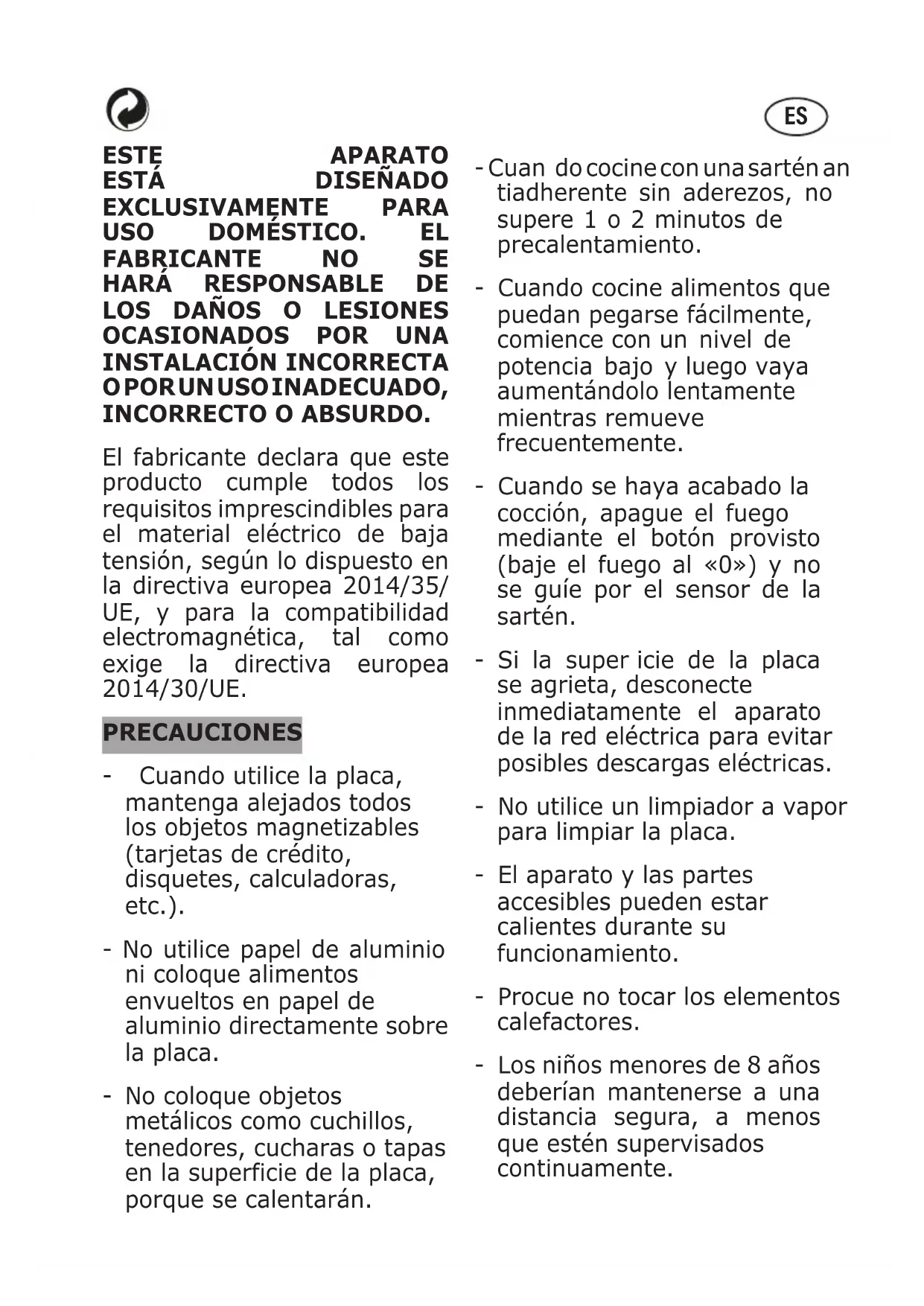 O POR UN USO INADECUADO, INCORRECTO O ABSURDO. El fabricante declara que este producto cumple todos los requisitos imprescindibles para el material eléctrico de baja tensión, según lo dispuesto en la directiva europea 2014/35/ UE, y para la compatibilidad electromagnética, tal como exige la directiva europea 2014/30/UE. PRECAUCIONES - Cuando utilice la placa, mantenga alejados todos los objetos magnetizables (tarjetas de crédito, disquetes, calculadoras, etc.). - No utilice papel de aluminio ni coloque alimentos envueltos en papel de aluminio directamente sobre la placa.
