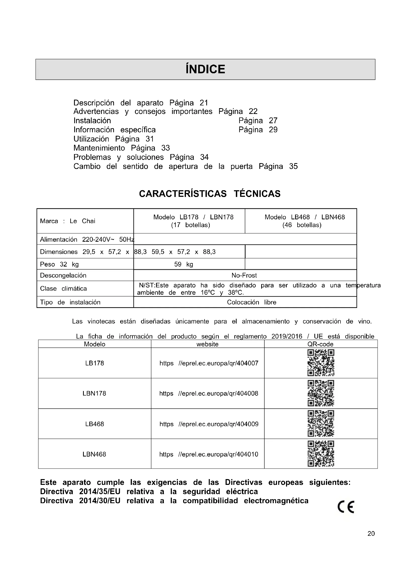 Marca : Le Chai Modelo LB178 / LBN178 (17 botellas) Modelo LB468 / LBN468 (46 botellas) Alimentación 220-240V~ 50Hz Dimensiones 29,5 x 57,2 x 88,3 59,5 x 57,2 x 88,3 Peso 32 kg 59 kg Descongelación No-Frost Clase climática N/ST:Este aparato ha sido diseñado para ser utilizado a una temperatura ambiente de entre 16ºC y 38ºC. Tipo de instalación Colocación libre Las vinotecas están diseñadas únicamente para el almacenamiento y conservación de vino. La ficha de información del producto según el reglamento 2019/2016 / UE está disponible Modelo website QR-code LB178 https //eprel.ec.europa/qr/404007 LBN178 https //eprel.ec.europa/qr/404008 LB468 https //eprel.ec.europa/qr/404009 LBN468 https //eprel.ec.europa/qr/404010 Este aparato cumple las exigencias de las Directivas europeas siguientes: Directiva 2014/35/EU relativa a la seguridad eléctrica Directiva 2014/30/EU relativa a la compatibilidad electromagnética21