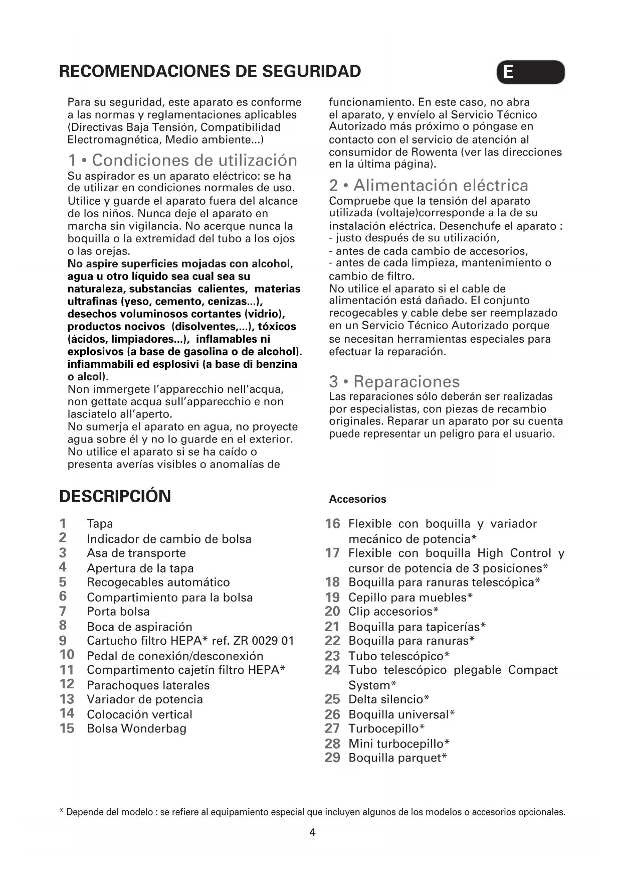 - Depende del modelo : se refiere al equipamiento especial que incluyen algunos de los modelos o accesorios opcionales. Para su seguridad, este aparato es conforme a las normas y reglamentaciones aplicables (Directivas Baja Tensión, Compatibilidad Electromagnética, Medio ambiente...) 1 • Condiciones de utilización Su aspirador es un aparato eléctrico: se ha de utilizar en condiciones normales de uso. Utilice y guarde el aparato fuera del alcance de los niños. Nunca deje el aparato en marcha sin vigilancia. No acerque nunca la boquilla o la extremidad del tubo a los ojos o las orejas. No aspire superficies mojadas con alcohol, agua u otro líquido sea cual sea su naturaleza, substancias calientes, materias ultrafinas (yeso, cemento, cenizas...), desechos voluminosos cortantes (vidrio), productos nocivos (disolventes,...), tóxicos (ácidos, limpiadores...), inflamables ni explosivos (a base de gasolina o de alcohol). infiammabili ed esplosivi (a base di benzina o alcol). Non immergete l’apparecchio nell’acqua, non gettate acqua sull’apparecchio e non lasciatelo all’aperto. No sumerja el aparato en agua, no proyecte agua sobre él y no lo guarde en el exterior. No utilice el aparato si se ha caído o presenta averías visibles o anomalías de funcionamiento. En este caso, no abra el aparato, y envíelo al Servicio Técnico Autorizado más próximo o póngase en contacto con el servicio de atención al consumidor de Rowenta (ver las direcciones en la última página). 2 • Alimentación eléctrica Compruebe que la tensión del aparato utilizada (voltaje)corresponde a la de su instalación eléctrica. Desenchufe el aparato : - justo después de su utilización, - antes de cada cambio de accesorios, - antes de cada limpieza, mantenimiento o cambio de filtro. No utilice el aparato si el cable de alimentación está dañado. El conjunto recogecables y cable debe ser reemplazado en un Servicio Técnico Autorizado porque se necesitan herramientas especiales para efectuar la reparación. 3 • Reparaciones Las reparaciones sólo deberán ser realizadas por especialistas, con piezas de recambio originales. Reparar un aparato por su cuenta puede representar un peligro para el usuario.