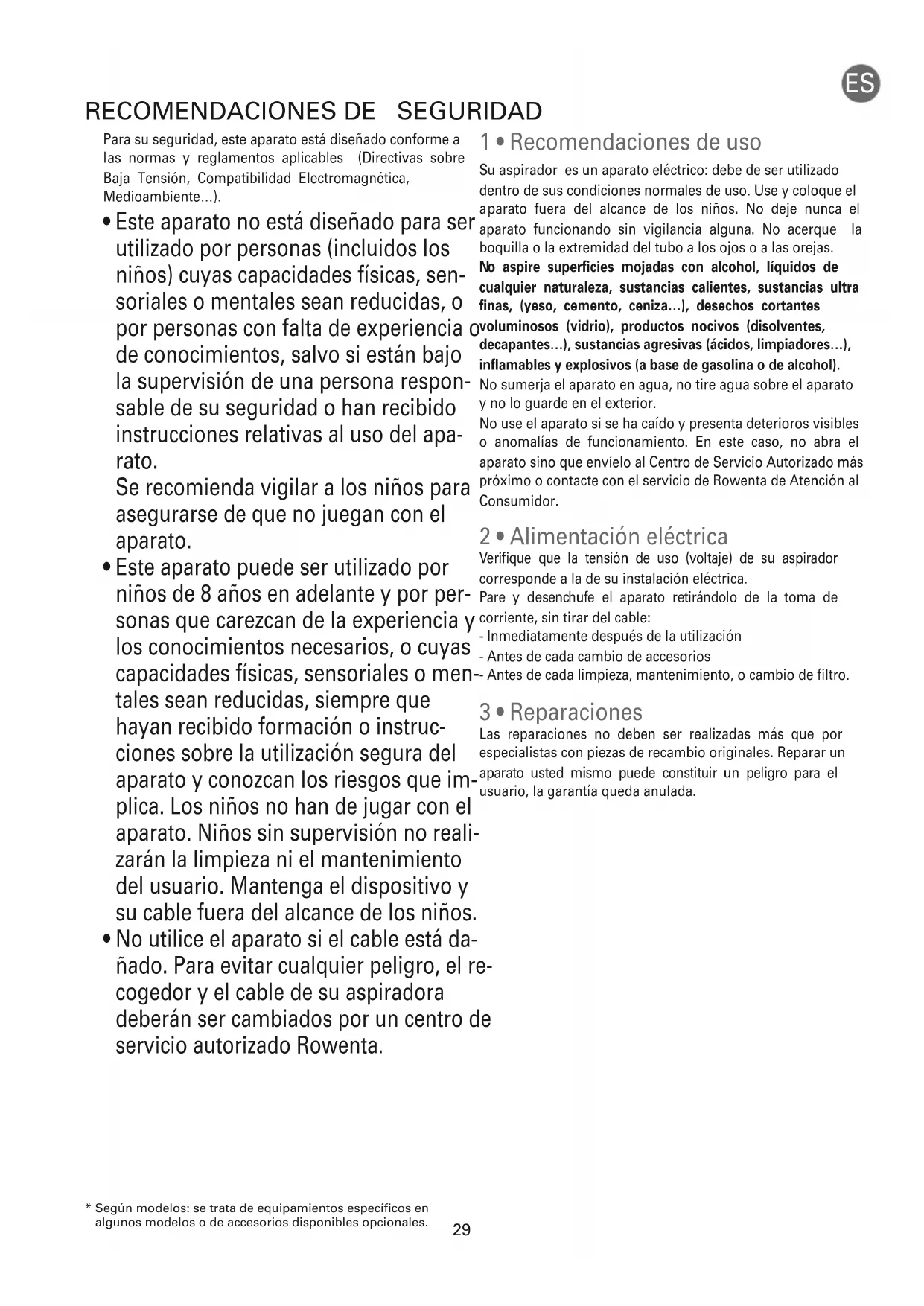 o aspire superficies mojadas con alcohol, líquidos de cualquier naturaleza, sustancias calientes, sustancias ultra finas, (yeso, cemento, ceniza…), desechos cortantes voluminosos (vidrio), productos nocivos (disolventes, decapantes…), sustancias agresivas (ácidos, limpiadores…), inflamables y explosivos (a base de gasolina o de alcohol). No sumerja el aparato en agua, no tire agua sobre el aparato y no lo guarde en el exterior. No use el aparato si se ha caído y presenta deterioros visibles o anomalías de funcionamiento. En este caso, no abra el aparato sino que envíelo al Centro de Servicio Autorizado más próximo o contacte con el servicio de Rowenta de Atención al Consumidor. 2 • Alimentación eléctrica Verifique que la tensión de uso (voltaje) de su aspirador corresponde a la de su instalación eléctrica. Pare y desenchufe el aparato retirándolo de la toma de corriente, sin tirar del cable: - Inmediatamente después de la utilización - Antes de cada cambio de accesorios - Antes de cada limpieza, mantenimiento, o cambio de filtro. 3 • Reparaciones Las reparaciones no deben ser realizadas más que por especialistas con piezas de recambio originales. Reparar un aparato usted mismo puede constituir un peligro para el usuario, la garantía queda anulada.