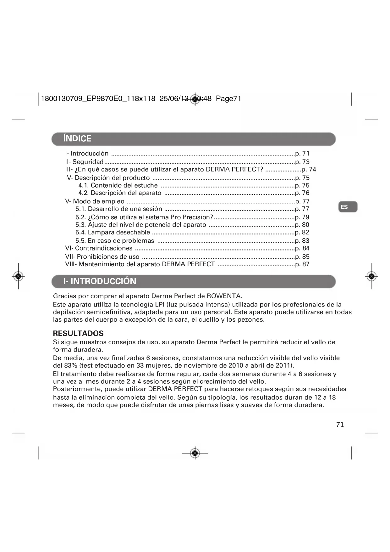 1800130709_EP9870E0_118x118 25/06/13 10:48 Page70I- Introducción ...........................................................................................................p. 71 II- Seguridad...............................................................................................................p. 73 III- ¿En qué casos se puede utilizar el aparato DERMA PERFECT? .....................p. 74 IV- Descripción del producto ...................................................................................p. 75 4.1. Contenido del estuche ..............................................................................p. 75 4.2. Descripción del aparato ............................................................................p. 76 V- Modo de empleo ..................................................................................................p. 77 5.1. Desarrollo de una sesión ............................................................................p. 77 5.2. ¿Cómo se utiliza el sistema Pro Precision?...............................................p. 79 5.3. Ajuste del nivel de potencia del aparato ..................................................p. 80 5.4. Lámpara desechable ...................................................................................p. 82 5.5. En caso de problemas ................................................................................p. 83 VI- Contraindicaciones .............................................................................................p. 84 VII- Prohibiciones de uso .........................................................................................p. 85 VIII- Mantenimiento del aparato DERMA PERFECT .............................................p. 87 Gracias por comprar el aparato Derma Perfect de ROWENTA. Este aparato utiliza la tecnología LPI (luz pulsada intensa) utilizada por los profesionales de la depilación semidefinitiva, adaptada para un uso personal. Este aparato puede utilizarse en todas las partes del cuerpo a excepción de la cara, el cuelllo y los pezones. RESULTADOS Si sigue nuestros consejos de uso, su aparato Derma Perfect le permitirá reducir el vello de forma duradera. De media, una vez finalizadas 6 sesiones, constatamos una reducción visible del vello visible del 83% (test efectuado en 33 mujeres, de noviembre de 2010 a abril de 2011). El tratamiento debe realizarse de forma regular, cada dos semanas durante 4 a 6 sesiones y una vez al mes durante 2 a 4 sesiones según el crecimiento del vello. Posteriormente, puede utilizar DERMA PERFECT para hacerse retoques según sus necesidades hasta la eliminación completa del vello. Según su tipología, los resultados duran de 12 a 18 meses, de modo que puede disfrutar de unas piernas lisas y suaves de forma duradera. ÍNDICE