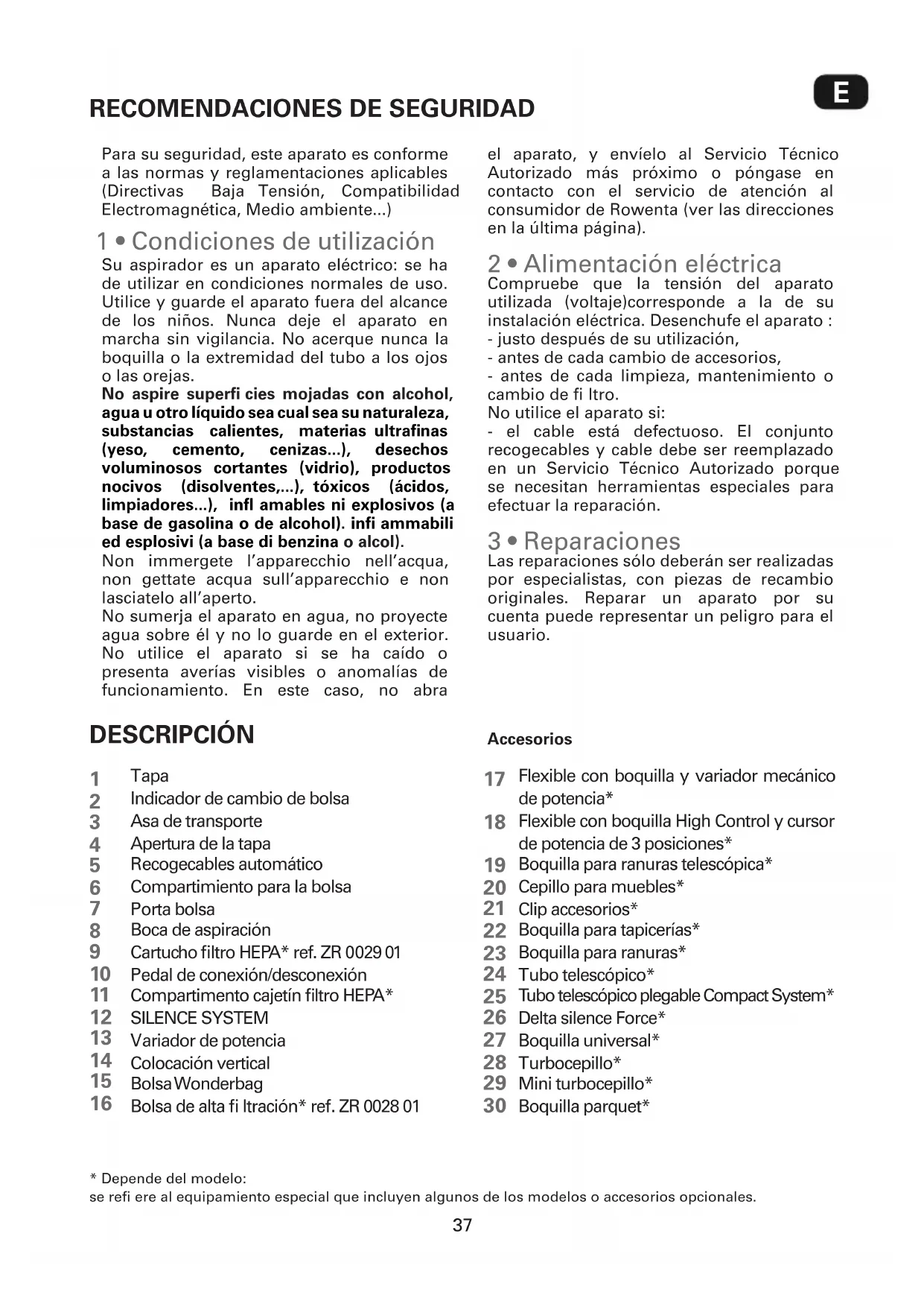 Para su seguridad, este aparato es conforme a las normas y reglamentaciones aplicables (Directivas Baja Tensión, Compatibilidad Electromagnética, Medio ambiente...)Su aspirador es un aparato eléctrico: se ha de utilizar en condiciones normales de uso. Utilice y guarde el aparato fuera del alcance de los niños. Nunca deje el aparato en marcha sin vigilancia. No acerque nunca la boquilla o la extremidad del tubo a los ojos o las orejas. No aspire superfi cies mojadas con alcohol, agua u otro líquido sea cual sea su naturaleza, substancias calientes, materias ultrafi nas (yeso, cemento, cenizas...), desechos voluminosos cortantes (vidrio), productos nocivos (disolventes,...), tóxicos (ácidos, limpiadores...), infl amables ni explosivos (a base de gasolina o de alcohol). infi ammabili ed esplosivi (a base di benzina o alcol).Non immergete l’apparecchio nell’acqua, non gettate acqua sull’apparecchio e non lasciatelo all’aperto.No sumerja el aparato en agua, no proyecte agua sobre él y no lo guarde en el exterior. No utilice el aparato si se ha caído o presenta averías visibles o anomalías de funcionamiento. En este caso, no abra el aparato, y envíelo al Servicio Técnico Autorizado más próximo o póngase en contacto con el servicio de atención al consumidor de Rowenta (ver las direcciones en la última página).Compruebe que la tensión del aparato utilizada (voltaje)corresponde a la de su instalación eléctrica. Desenchufe el aparato :- justo después de su utilización,- antes de cada cambio de accesorios,- antes de cada limpieza, mantenimiento o cambio de fi ltro.No utilice el aparato si:- el cable está defectuoso. El conjunto recogecables y cable debe ser reemplazado en un Servicio Técnico Autorizado porque se necesitan herramientas especiales para efectuar la reparación.Las reparaciones sólo deberán ser realizadas por especialistas, con piezas de recambio originales. Reparar un aparato por su cuenta puede representar un peligro para el usuario.
