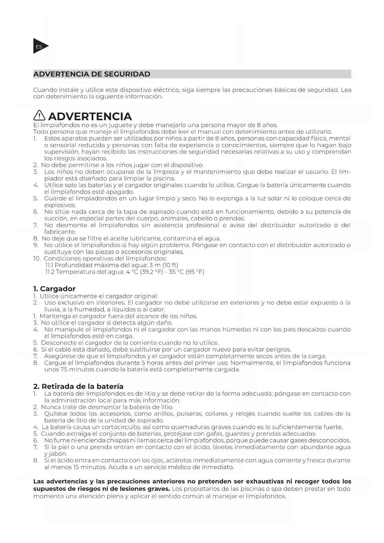 Cuando instale y utilice este dispositivo eléctrico, siga siempre las precauciones básicas de seguridad. Lea con detenimiento la siguiente información. ADVERTENCIA El limpiafondos no es un juguete y debe manejarlo una persona mayor de 8años. Toda persona que maneje el limpiafondos debe leer el manual con detenimiento antes de utilizarlo.