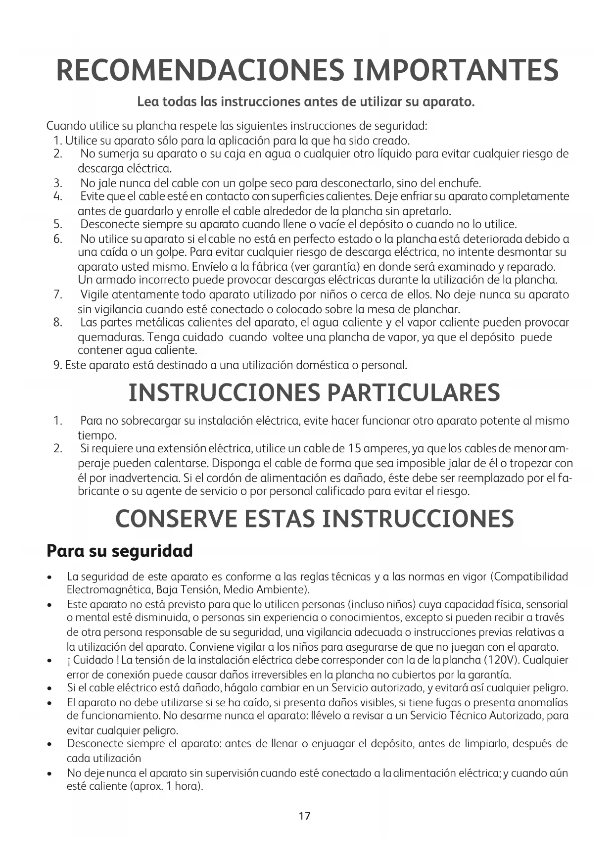- No deje nunca el aparato sin supervisión cuando esté conectado a la alimentación eléctrica; y cuando aún esté caliente (aprox. 1 hora). RECOMENDACIONES IMPORTANTES Lea todas las instrucciones antes de utilizar su aparato. Cuando utilice su plancha respete las siguientes instrucciones de seguridad:11. Utilice su aparato sólo para la aplicación para la que ha sido creado.