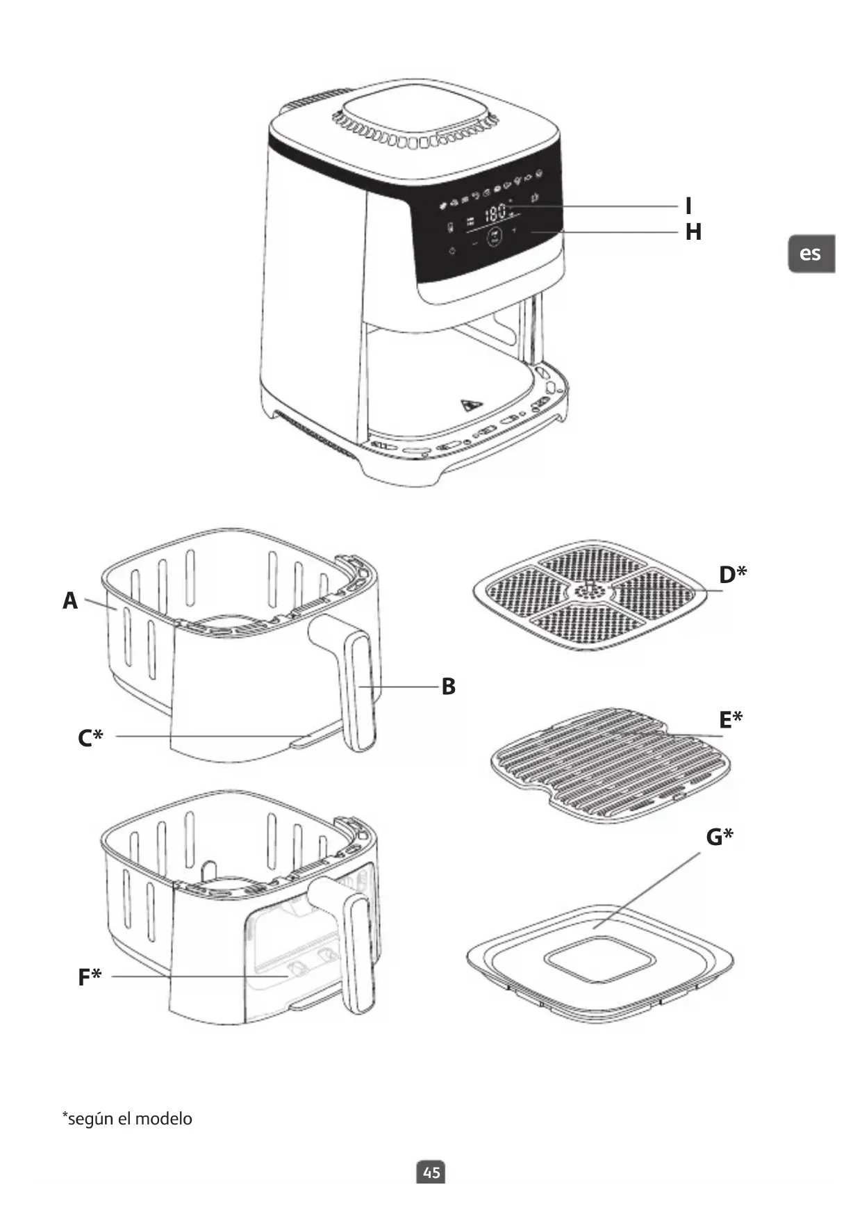 - También puedes colocar la tapa en la cesta para guardar las sobras en el frigorífico. Cuidado: No coloques la tapa si el recipiente todavía está caliente. DESCRIPCIÓN A. Canasta B. Asa de la canasta C. Parte frontal desmontable D. Rejilla extraíble E. Rejilla de parrilla de aluminio fundido extraíble* F. Parte frontal desmontable con ventanilla de visualización G. Rejilla extraíble H. Panel táctil digital