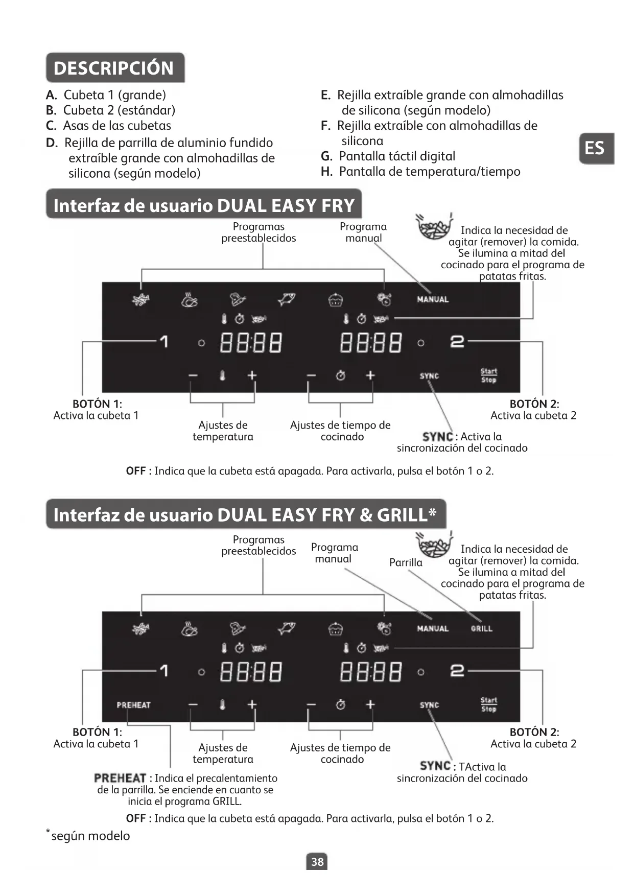DESCRIPCIÓN A. Cubeta 1 (grande) B. Cubeta 2 (estándar) C. Asas de las cubetas D. Rejilla de parrilla de aluminio fundido extraíble grande con almohadillas de silicona (según modelo) E. Rejilla extraíble grande con almohadillas de silicona (según modelo) F. Rejilla extraíble con almohadillas de silicona G. Pantalla táctil digital H. Pantalla de temperatura/tiempo Interfaz de usuario DUAL EASY FRY Interfaz de usuario DUAL EASY FRY & GRILL* OFF : Indica que la cubeta está apagada. Para activarla, pulsa el botón 1 o 2. OFF : Indica que la cubeta está apagada. Para activarla, pulsa el botón 1 o 2. : Indica el precalentamiento de la parrilla. Se enciende en cuanto se inicia el programa GRILL.