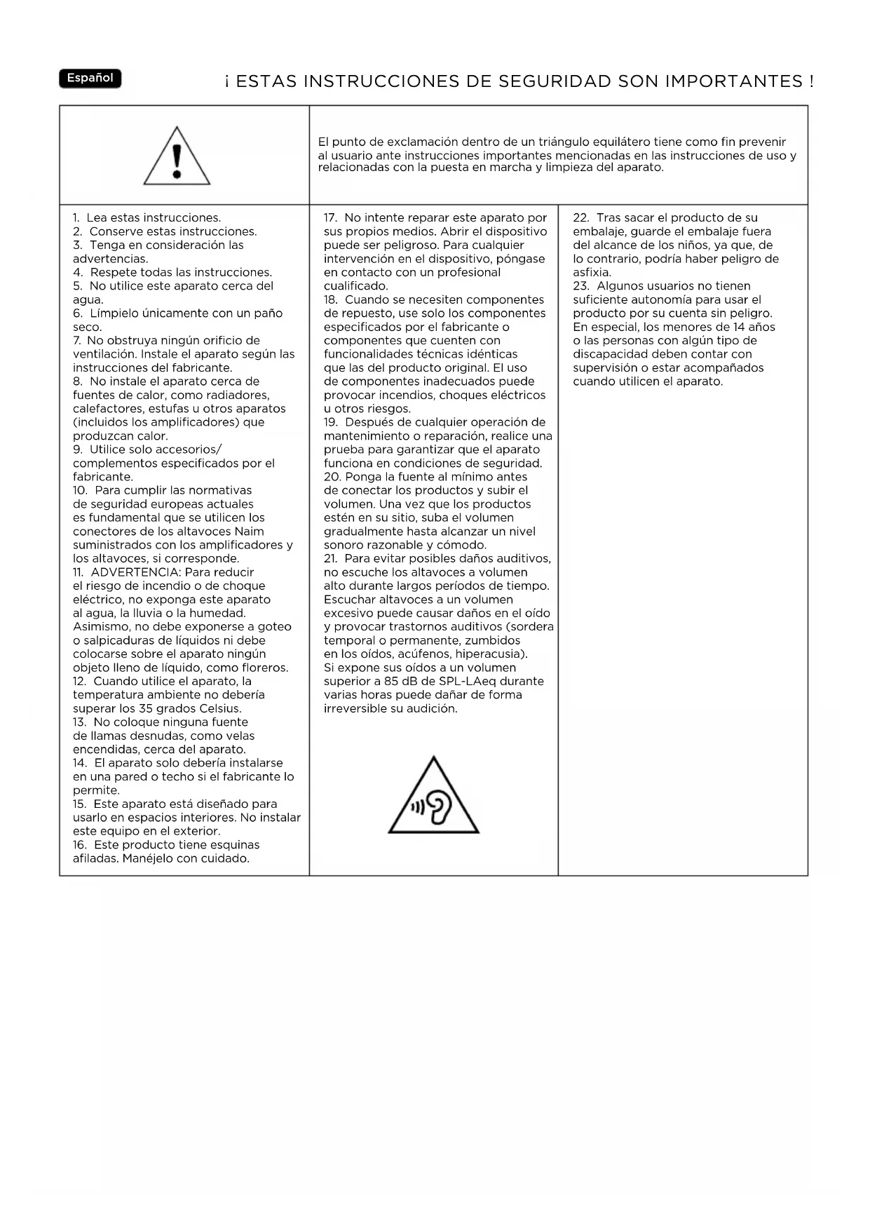 no escuche los altavoces a volumen alto durante largos períodos de tiempo. Escuchar altavoces a un volumen excesivo puede causar daños en el oído y provocar trastornos auditivos (sordera temporal o permanente, zumbidos en los oídos, acúfenos, hiperacusia). Si expone sus oídos a un volumen superior a 85dB de SPL-LAeq durante varias horas puede dañar de forma irreversible su audición.