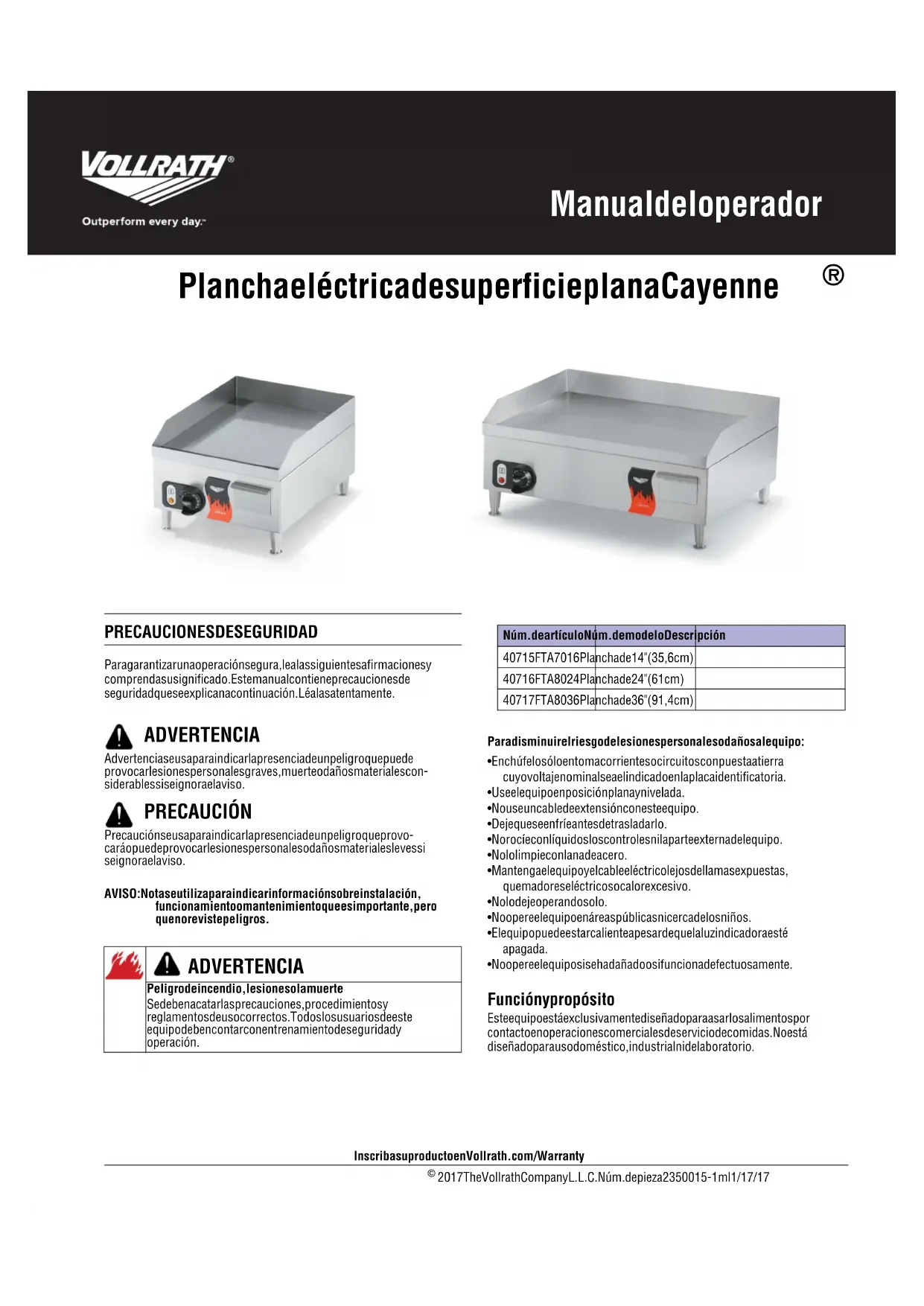 AVISO: No permita que la plancha se quede sin sazonar o sin una capa delgada de aceite de cocer para evitar la corrosión. PRECAUCIÓN Peligro de quemaduras Las superficies y alimentos calientes pueden quemar la piel. Deje que las superficies calientes se enfríen antes de manipularlas. No vierta ni derrame agua en la superficie de cocción pues ello provocará salpicaduras. ADVERTENCIA Peligro de descarga eléctrica. Evite que ingrese agua o cualquier otro tipo de líquido al interior de la unidad, ya que ello podría causar una descarga eléctrica. No rocíe agua ni agentes de limpieza. El líquido podría hacer contacto con los componentes electrónicos y causar un cortocircuito o descarga eléctrica. PRECAUCIÓN Peligro de quemaduras Las superficies y alimentos calientes pueden quemar la piel. Deje que las superficies calientes se enfríen antes de manipularlas. No vierta ni derrame agua en la superficie de cocción pues ello provocará salpicaduras.© 2017 The Vollrath Company L.L.C. Núm. de pieza 2350015-1 ml 1/17/17 The Vollrath Company, L.L.C. Headquarters 1236 North 18th Street Sheboygan, Wisconsin 53081-3201 USA Main Tel: 800-624-2051 or 920-457-4851 Main Fax: 800-752-5620 or 920-459-6573 Canada Customer Service: 800-695-8560 Tech Services: techservicereps@vollrathco.com www.vollrath.com Vollrath Europe BV Beneluxbaan 7 5121 AD RIJEN The Netherlands +31161870005 Vollrath of China Vollrath Shanghai Trading Limited 23A, Time Square Plaza | 500 Zhang Yang Road Pudong, Shanghai 200122 Tel: 86-21-50589580 Vollrath de Mexico S. de R.L. de C.V. Periferico Sur No. 7980 Edificio 4-E Col. Santa Maria Tequepexpan 45600 Tlaquepaque, Jalisco | Mexico Tel: (52) 333-133-6767 Tel: (52) 333-133-6769 Fax: (52) 333-133-6768