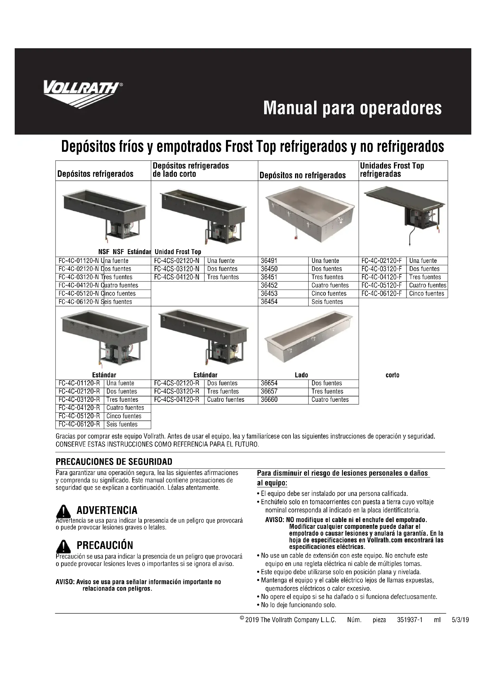Gracias por comprar este equipo Vollrath. Antes de usar el equipo, lea y familiarice con las siguientes instrucciones de operacion y seguridad. CONSERVE ESTAS INSTRUCCIONES COMO REFERENCIA PARA EL FUTURO.