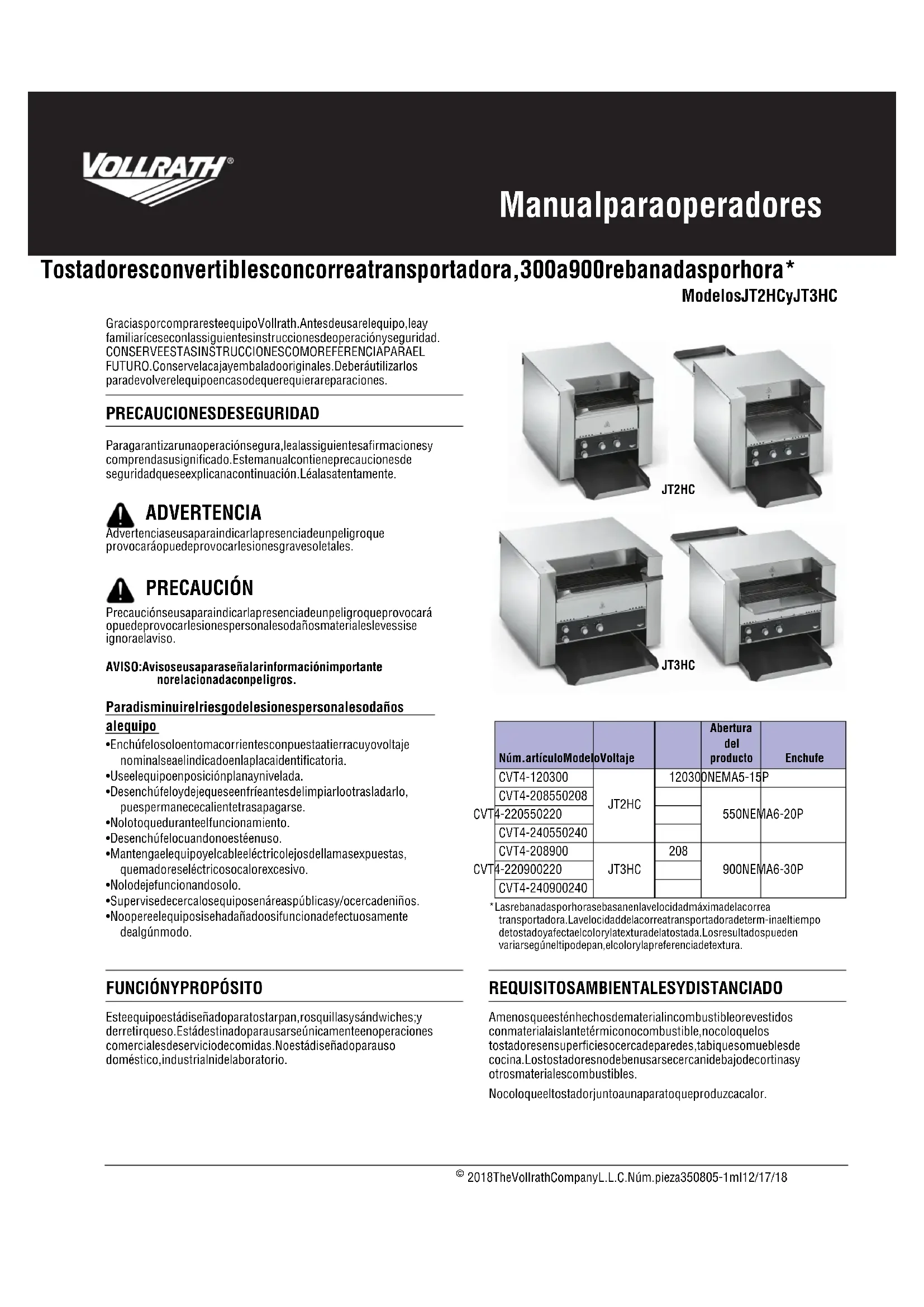 CVT4220900 - Tostadora Vollrath - Manual de uso y guía de instrucciones gratis