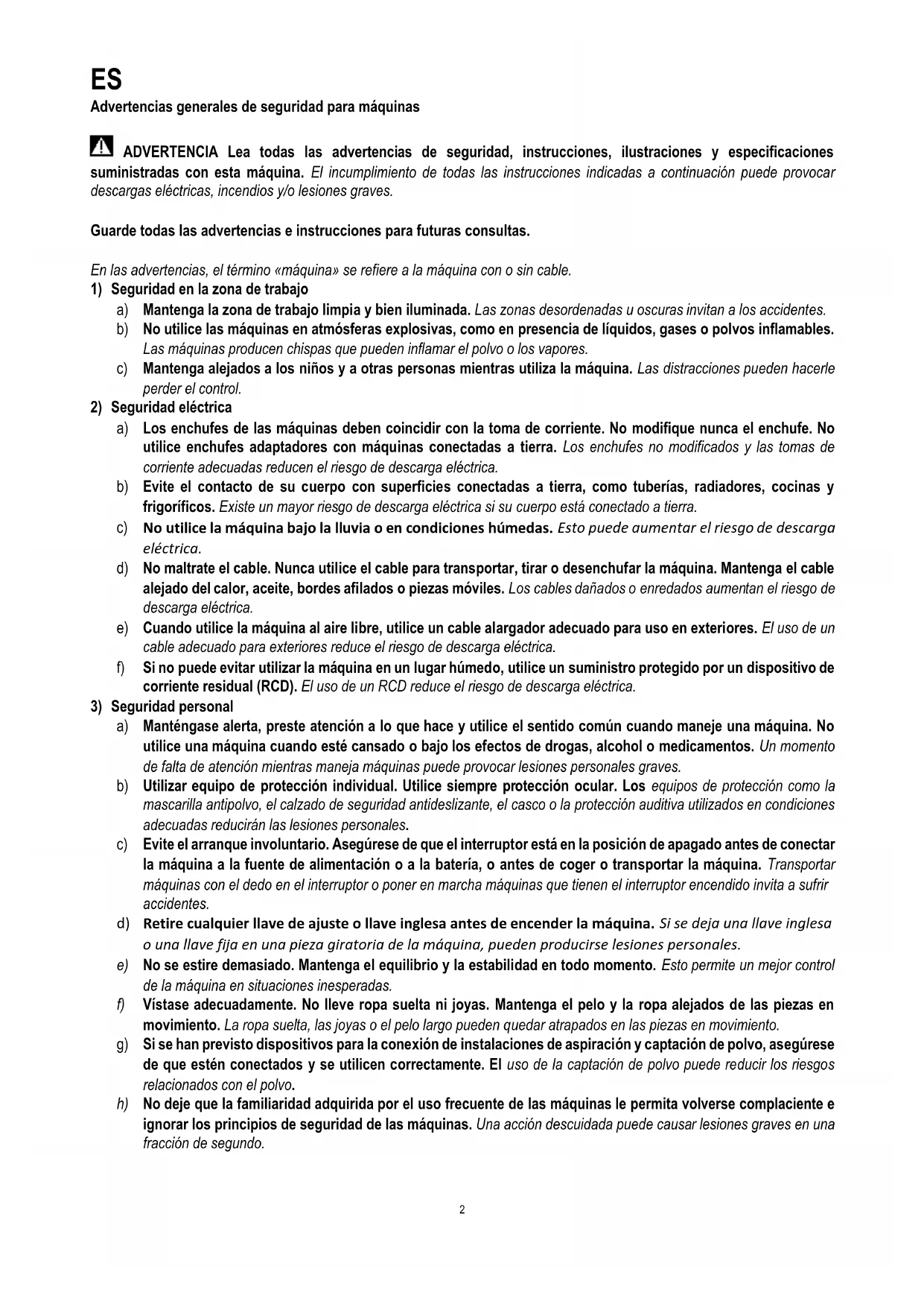 g) Utilice laquina, los accesos y las brocas, etc., de acuerdo con estas instrucciones, teniendo en cuenta las conditiones de trabajo y el trabajo a realizar. El uso de laquina para operaciones distinctas de las previstas podra provocar una situacion peligrosa.
