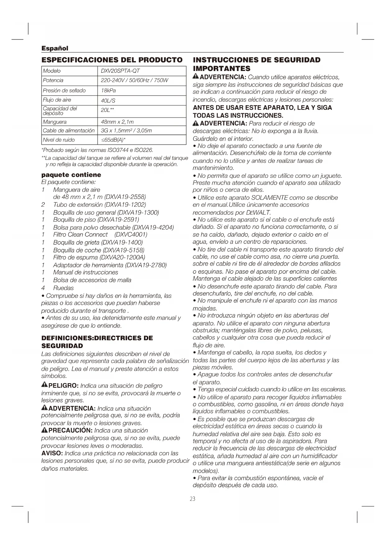 - Para evitar la combustión espontánea, vacíe el depósito después de cada uso. ANTES DE USAR ESTE APARATO, LEA Y SIGA TODAS LAS INSTRUCCIONES. *Probado según las normas ISO3744 e ISO226. **La capacidad del tanque se reere al volumen real del tanque y no reeja la capacidad disponible durante la operación.