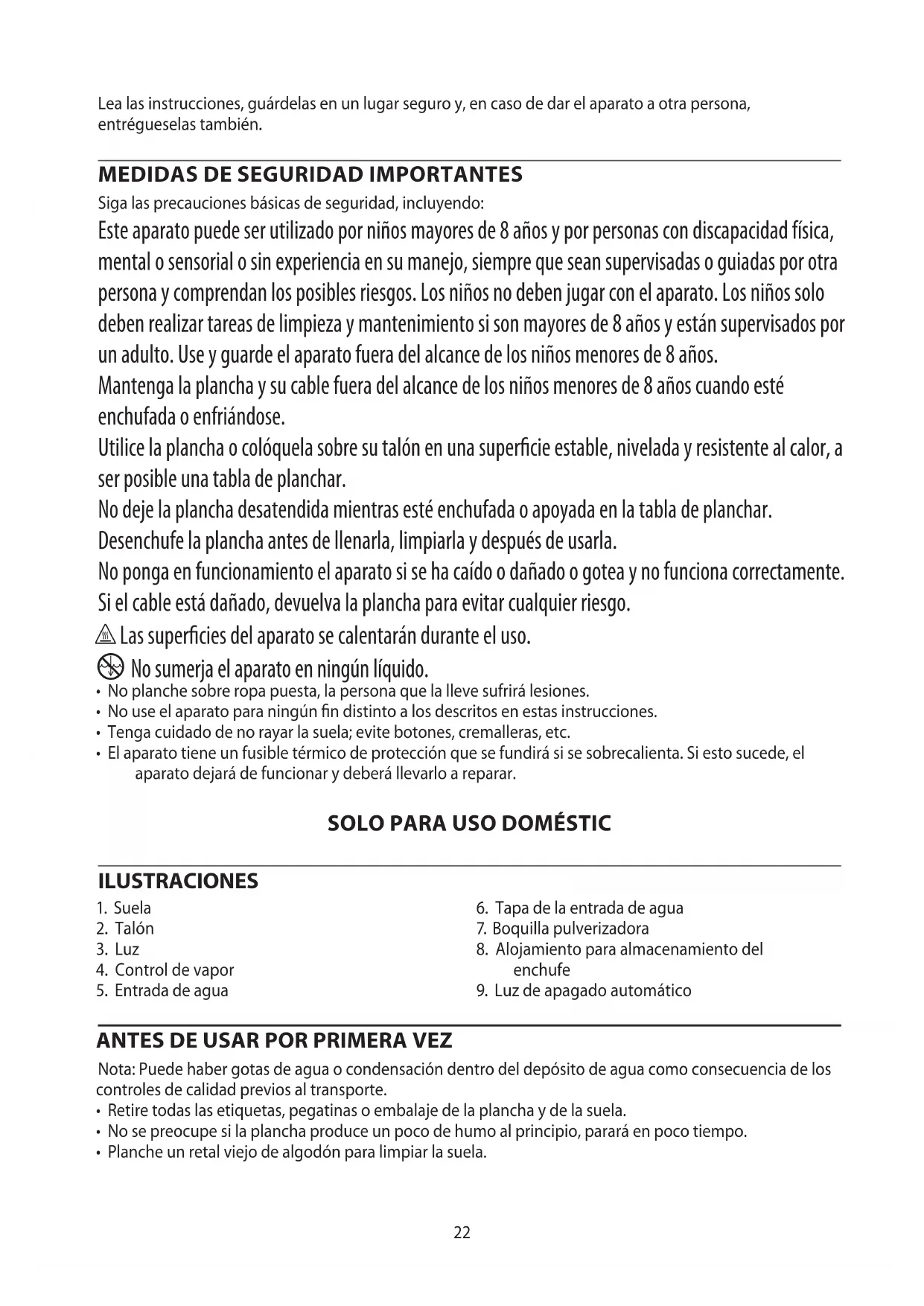 Siga las precauciones básicas de seguridad, incluyendo: Este aparato puede ser utilizado por niños mayores de 8 años y por personas con discapacidad física, mental o sensorial o sin experiencia en su manejo, siempre que sean supervisadas o guiadas por otra persona y comprendan los posibles riesgos. Los niños no deben jugar con el aparato. Los niños solo deben realizar tareas de limpieza y mantenimiento si son mayores de 8 años y están supervisados por un adulto. Use y guarde el aparato fuera del alcance de los niños menores de 8 años. Mantenga la plancha y su cable fuera del alcance de los niños menores de 8 años cuando esté enchufada o enfriándose. Utilice la plancha o colóquela sobre su talón en una superficie estable, nivelada y resistente al calor, a ser posible una tabla de planchar. No deje la plancha desatendida mientras esté enchufada o apoyada en la tabla de planchar. Desenchufe la plancha antes de llenarla, limpiarla y después de usarla. No ponga en funcionamiento el aparato si se ha caído o dañado o gotea y no funciona correctamente. Si el cable está dañado, devuelva la plancha para evitar cualquier riesgo. h Las superficies del aparato se calentarán durante el uso.