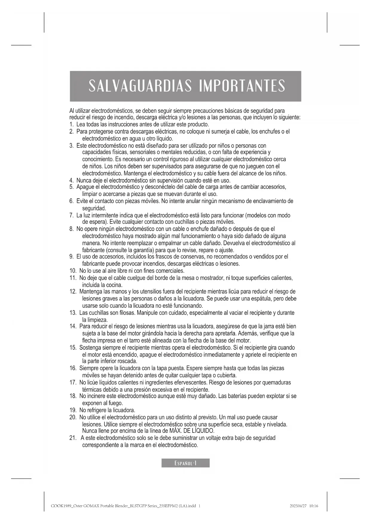 correspondiente a la marca en el electrodoméstico. COOK1989_Oster GOMAX Portable Blender_BLSTGFP Series_25SEFPM2 (LA).indd 1COOK1989_Oster GOMAX Portable Blender_BLSTGFP Series_25SEFPM2 (LA).indd 1 2025/6/27 10:162025/6/27 10:16Español-2 ACERCA DE LA CARGA DE LA BATERÍA ADVERTENCIA: No coloque objetos metálicos sobre los terminales positivo (+) y negativo (-) de la batería o los terminales del cargador. Utilice únicamente la batería o el paquete de baterías suministrado por el fabricante. No cargue, coloque ni deje el aparato en lugares donde se prevea que pueda ser dañado por animales, niños pequeños o pueda estar expuesto a la intemperie. No deseche los paquetes de baterías agotadas en el fuego. Guarde el cargador, la batería y la licuadora a temperatura ambiente. Las baterías agotadas/baterías recargables no deben desecharse con la basura doméstica. Deséchelas en un estado completamente descargado de acuerdo con las regulaciones legales locales. Su licuadora viene con un cable de carga USB-C a USB-A. Puede cargar su licuadora a través del puerto de carga (ubicado en la parte posterior de la base del motor). No tire, retuerza ni utilice de forma indebida del cable de carga. Si usa un adaptador de corriente certificado de 5 V/2 A a 3 A, la carga desde completamente descargada hasta completamente cargada puede tardar hasta 2,5 horas. IMPORTANTE: Asegúrese de desconectar el cable de carga antes de utilizar la licuadora, ya que no está diseñada para funcionar mientras el cable de carga está enchufado. Aunque la licuadora no está diseñada para funcionar mientras se carga, hay que tener cuidado con las cuchillas en todo momento. Las 4 luces LED blancas indicadoras de batería en la parte inferior del motor de la licuadora muestran el nivel de la batería o el estado de carga. Ver la tabla a continuación. Si la batería está completamente descargada, las luces LED no se encenderán, lo que indica que debe cargarse completamente (hasta 2,5 horas) antes de usarla sin el cable de carga. Los LED de la batería muestran el estado actual en un gráfico. LED de la batería iluminados Nivel de carga Número de ciclos por estado 4 LED blancos encendidos de forma permanente Carga completa (75 % - 100 %) Más de 15 3 LED blancos encendidos de forma permanente Carga parcial (50 % - 74 %) Más de 10 2 LED blancos encendidos de forma permanente Carga parcial (25 % - 49 %) 3 o más 1 LED blanco encendido de forma permanente Carga baja (1 % - 24 %) Menos de 3 1 LED blanco intermitente o todos los LED apagados Sin carga (0 %) 0 COOK1989_Oster GOMAX Portable Blender_BLSTGFP Series_25SEFPM2 (LA).indd 2COOK1989_Oster GOMAX Portable Blender_BLSTGFP Series_25SEFPM2 (LA).indd 2 2025/6/27 10:162025/6/27 10:16Español-3
