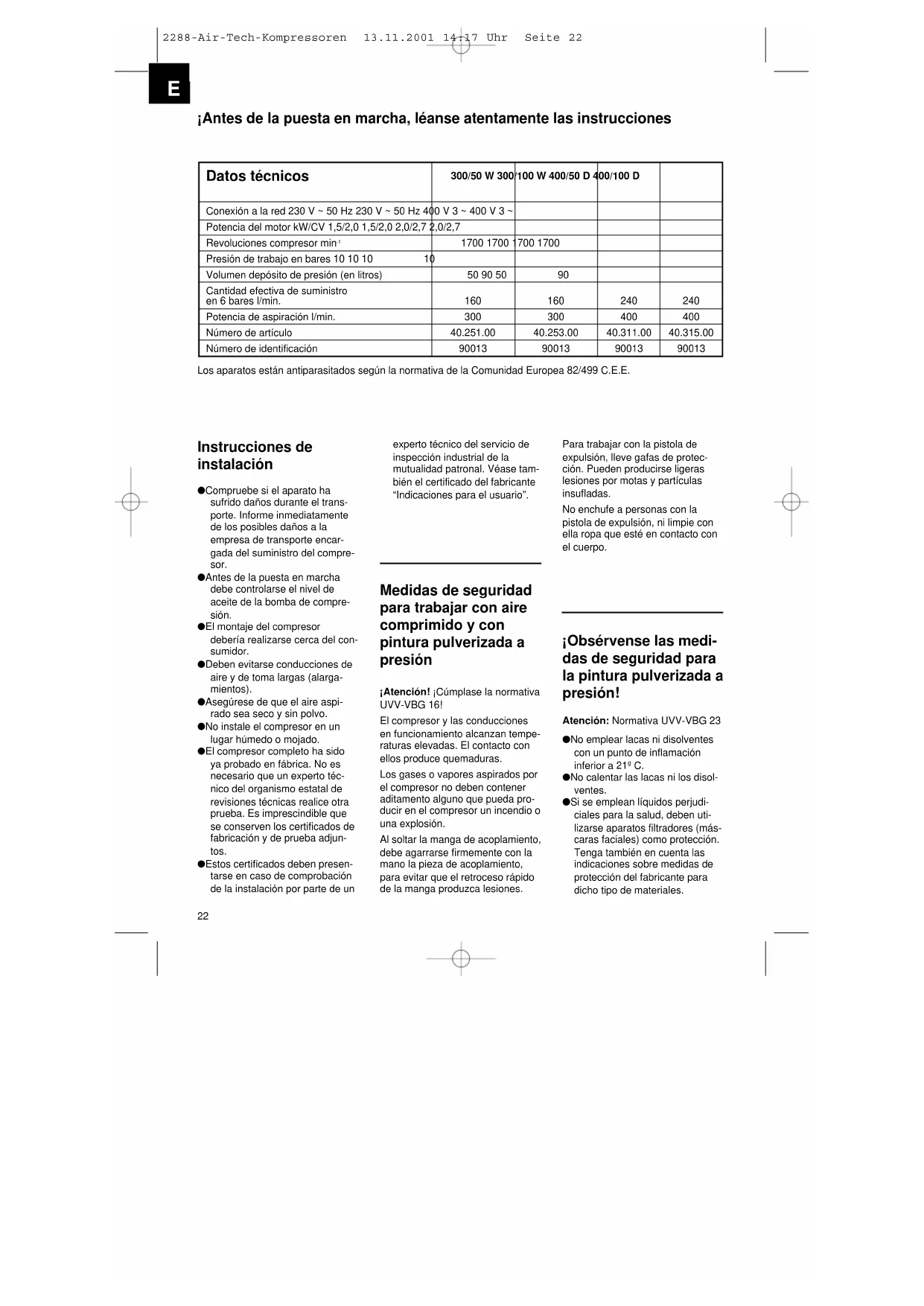 Los aparatos están antiparasitados según la normativa de la Comunidad Europea 82/499 C.E.E. Instrucciones de instalación ● Compruebe si el aparato ha sufrido daños durante el trans- porte. Informe inmediatamente de los posibles daños a la empresa de transporte encar- gada del suministro del compre- sor. ● Antes de la puesta en marcha debe controlarse el nivel de aceite de la bomba de compre- sión. ● El montaje del compresor debería realizarse cerca del con- sumidor. ● Deben evitarse conducciones de aire y de toma largas (alarga- mientos). ● Asegúrese de que el aire aspi- rado sea seco y sin polvo. ● No instale el compresor en un lugar húmedo o mojado. ● El compresor completo ha sido ya probado en fábrica. No es necesario que un experto téc- nico del organismo estatal de revisiones técnicas realice otra prueba. Es imprescindible que se conserven los certificados de fabricación y de prueba adjun- tos. ● Estos certificados deben presen- tarse en caso de comprobación de la instalación por parte de un 2288-Air-Tech-Kompressoren 13.11.2001 14:17 Uhr Seite 22● No se permite fumar durante el proceso de inyección ni en el lugar de trabajo. Los vapores de la pintura son también fácilmente inflamables. ● No puede haber en el lugar fuego, luces encendidas, ni pue- den accionarse máquinas que produzcan chispas. ● No conservar ni consumir en el lugar de trabajo comidas ni bebi- das. Los vapores de la pintura son fácilmente inflamables. ● El lugar de trabajo debe tener más de 30 m