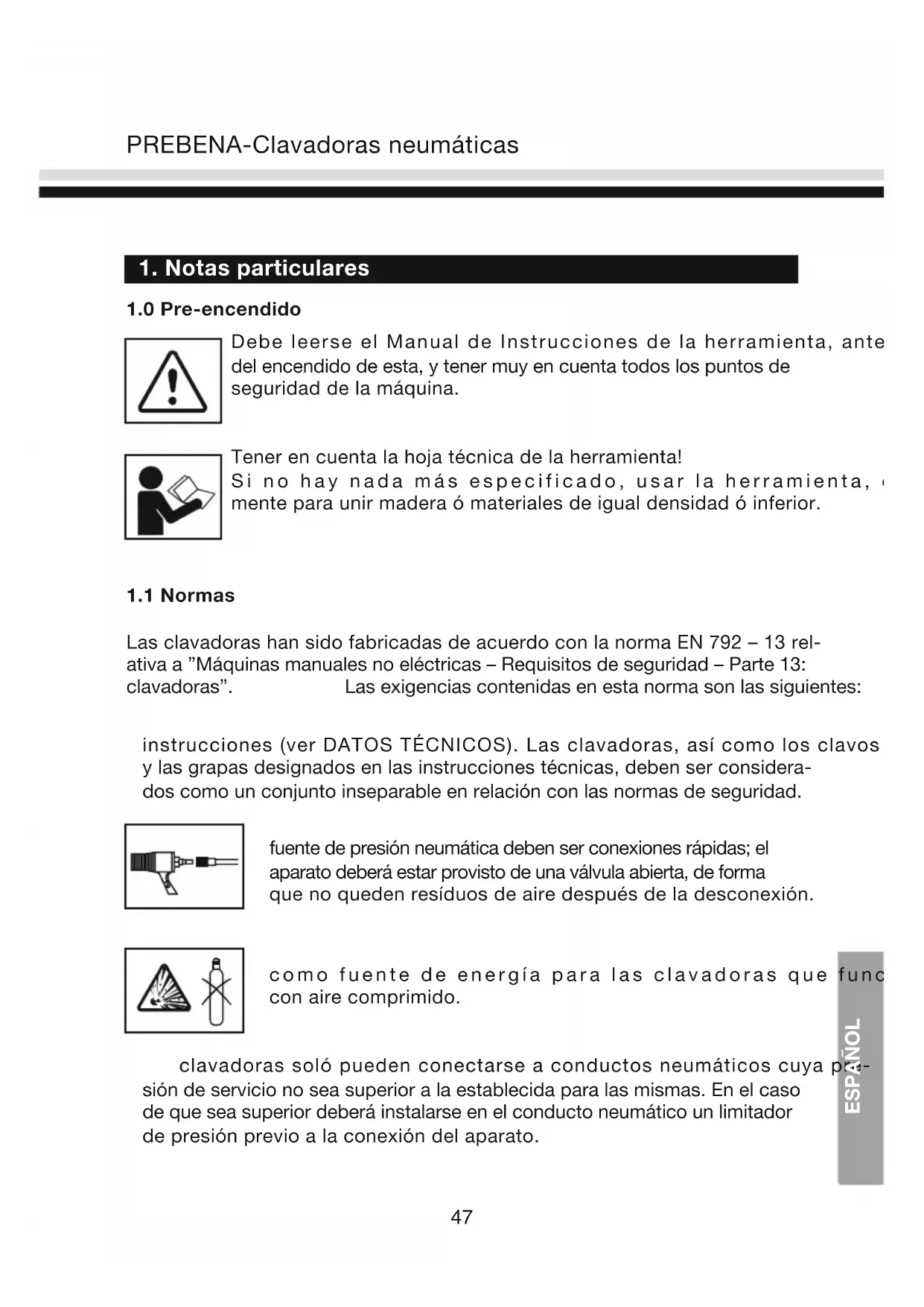Peligro! Si la clavadora está defectuosa o no funciona perfecta- mente, puede producir daños al usuario y a otras personas. Antes del trabajo comprobad si los dispositivos de seguridad y de pues- ta en marcha funcionan perfectamente y si todos los tornillos y tuercas estçn perfectamente apretados. No realizar intervenciones sobre la clavadora no conformes con las prescripciones del fabricante. No desmontar ni bioquear ningún elemento de la clavadora, tal como el dispositi- vo de bioqueo de seguridad del gatillo y otros. PREBENA-Clavadoras neumáticas ESPAÑOL50 Peligro! Si la clavadora está defectuosa o no funciona perfectamente, puede producir daños al usuario y a otras per- sonas. No efectuar reparaciones de fortuna recurriendo a medios inadecuados. La clavadora debe ser revisada regularmente y de forma apropiada. Evitar averias en el aparato y menoscabo de sus prestaciones procediendo, por ejemplo, a las operaciones siguientes: – Impactos o grabados y perforaciones. – Transformaciones no autorizadas por el constructor. – Trabajos sobre metales duros, teles como el acero. – Dejar caer o arrastrar el aparato por el suelo. – Utilizario como martillo. – Cualquier otra forma de utilizaciùn inapropiada.