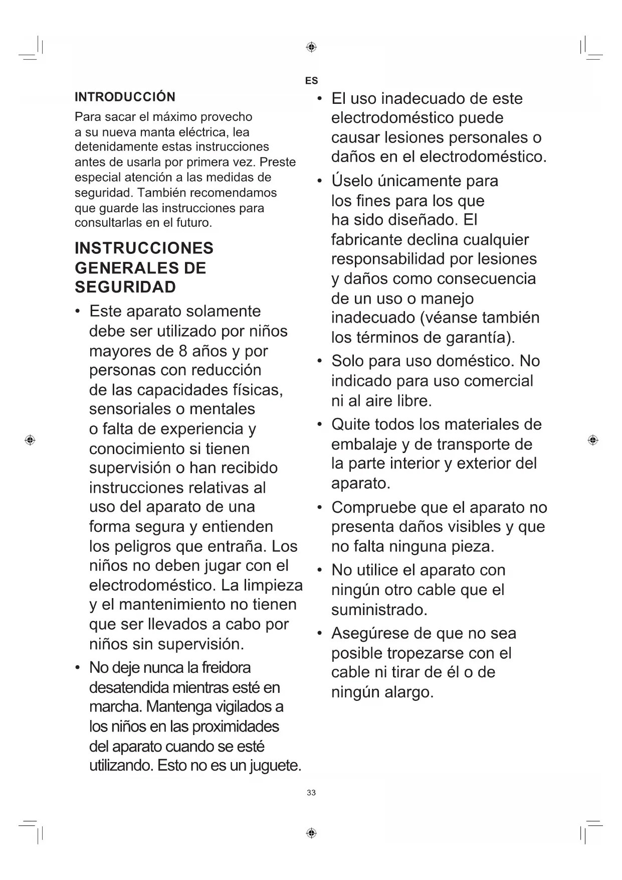 INTRODUCCIÓN Para sacar el máximo provecho a su nueva manta eléctrica, lea detenidamente estas instrucciones antes de usarla por primera vez. Preste especial atención a las medidas de seguridad. También recomendamos que guarde las instrucciones para consultarlas en el futuro. INSTRUCCIONES GENERALES DE SEGURIDAD