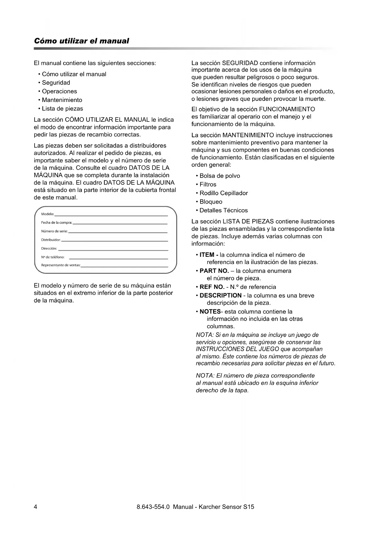 - NOTES- esta columna contiene la información no incluida en las otras columnas. NOTA: Si en la máquina se incluye un juego de servicio u opciones, asegúrese de conservar las INSTRUCCIONES DEL JUEGO que acompañan al mismo. Éste contiene los números de piezas de recambio necesarias para solicitar piezas en el futuro. NOTA: El número de pieza correspondiente al manual está ubicado en la esquina inferior derecho de la tapa. Modelo: Fecha de la compra: Número de serie: Distribuidor: Dirección: Nº de teléfono: Representante de ventas: 8.643-554.0 Manual - Karcher Sensor S155 Seguridad