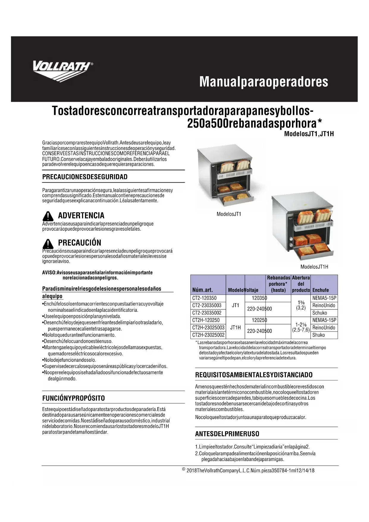 CT2H120250 - Tostadora Vollrath - Manual de uso y guía de instrucciones gratis