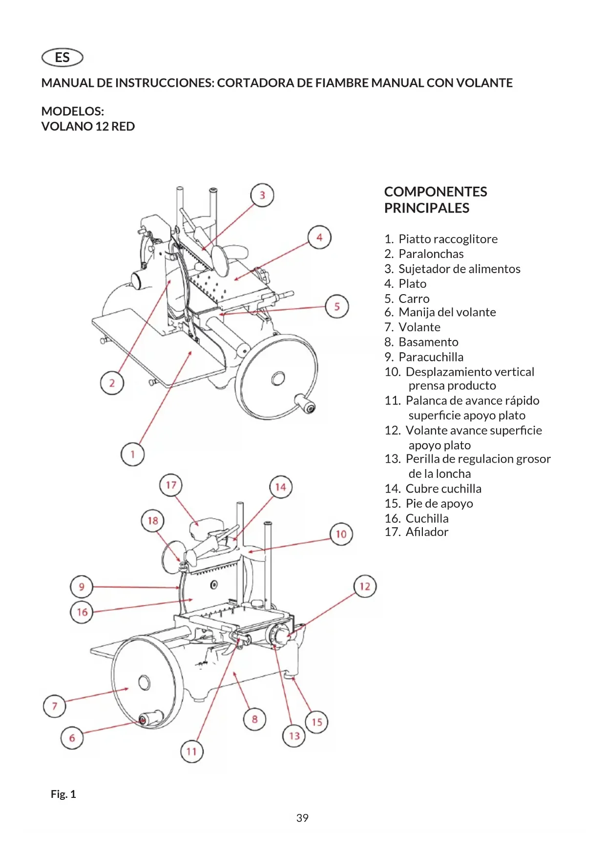 !42 cuando se termina de usar, y siempre antes de usarse des- pués de largos periodos de inactividad. Utilice guantes de protección resistentes al corte y al desgarro y realice todas las operaciones con sumo cuidado. Productos de limpieza: use únicamente agua con un paño suave, esponjoso y en su caso un cepillo de naylon semi- rrígido para las zonas del plato y del sujetador de alimentos. No use agua o vapor a presión ni métodos similares. DESMONTAJE - Compruebe que la protec- ción cubra adecuadamente la cuchilla (9) - Desatornille a mano la tuerca de bloqueo del desviador de lonchas y extráigalo. - Retire la cubeta - Retire la bandeja de alimen- tos girando la palanca de blo- queo, hacia la izquierda, solo levante la bandeja y extráigala. - Extraiga la bandeja de reco- lección. Si la bandeja estuviera bloqueada mediante dos tor- nillos laterales, aójelos antes de retirar la bandeja. ¡ATENCIÓN! Para algu- nos modelos, empuje el plato de alimentos hacia ade- lante antes de levantarla junto al sujetador de alimentos. LIMPIEZA - Cuchilla: presione con un paño húmedo la supercie de la cuchilla, moviéndolo lenta- mente desde el centro hacia afuera, como en la gura en el lado cubrecuchilla y en el lado opuesto. Seque la zona, con el mismo procedimiento, utilizan- do un paño seco; ¡ADVERTENCIA! No active la cortadora de ambres mientras se limpia la cuchilla. - aro de protección: use un ce- pillo de nylon semirrígido para la zona entre el aro y la cuchilla; ¡ATENCIÓN! ¡Cuchilla alada, peligro de corte Cuando la cuchilla no está cu- bierta por la protección, preste la máxima atención a mantener las manos lo más lejos posible del área no protegida. - cuerpo de la máquina: límp- ielo con un paño húmedo o una esponja, enjuagándolo con agua. Séquelo con cuidado. MONTAJE - Compruebe que la protec- ción cubra adecuadamente la cuchilla (9); - coloque de nuevo la cubeta en su posición; - cierre el paralonchas; - utilizando la manija del volan- te, gire el volante (7) para llevar completamente hacia adelante (hacia el operador) el plato (4); - con un movimiento vertical de arriba a bajo, coloque de nuevo el plato en su posición inicial. ATENCIÓN Para algu- nos modelos, tras haber posicionado el plato, empújela para jarla al soporte del plato. Si estuviera presente, cierre la palanca o apriete el selector en la bandeja de alimentos. MANTENIMIENTO Alado de la cuchilla La frecuencia y la duración del alado dependen del uso que se haga. ATENCIÓN ¡Cuchilla alada, peligro de corte! Cuando la cuchilla no está cu- bierta por la protección, preste la máxima atención a mantener las manos lo más lejos posible del área no protegida. Para alar la cuchilla, siga las instrucciones dependiendo del modelo indicado: VOLANO 12 RED (Fig. 6) - Limpie la cuchilla eliminando los residuos de grasa - Compruebe que la protec- ción cubra adecuadamente la cuchilla - Aleje la bandeja de alimentos de la cuchilla - Eleve el alador y gírelo 180°. - Baje con cuidado el alador, la cuchilla se centrará automátic- amente entre los dos muelles. - Pulse el botón (B) durante 10-15 segundos aproximada- mente y al mismo tiempo gire el volante. Suelte el botón (B), pulse el botón (C) durante 2-3 segundos y suéltelo. - Interrumpa la rotación del volante - Solo cuando la cuchilla está parada, reposicione el alador en su posición original y aprie- te el pomo . ATENCIÓN ¡Riesgo de daño! No prolongue ex- cesivamente (no más de 2-3 segundos) la operación de re- babado para evitar dañar la cuchilla. Lubricación (Fig. 7) - Vierta unas gotas de aceite en la barra (1) y en la junta de la perilla de regulación de grosor de la loncha (2); - vierta unas gotas de aceite en los agujeros (3 y 4); - vierta unas gotas de aceite en la junta entre volante y cuerpo del alador (5); - accionar brevemente el vo- lante.
