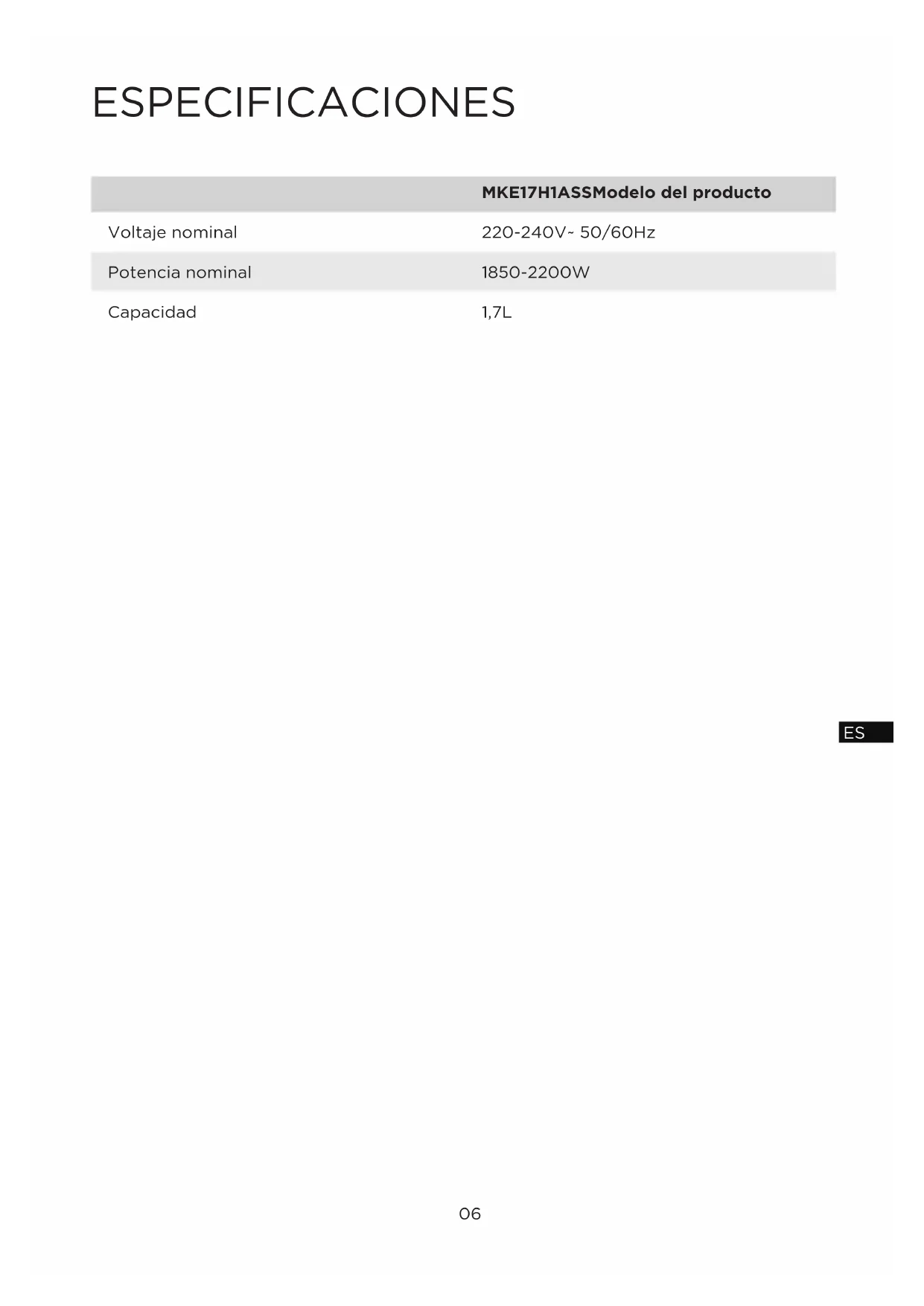Modo Modo apagado (enchufe conectado) modo de espera (después de la operación) 0,5 W 0,8 W 20 minutos 20 minutos consumo eléctrico Tiempo para que el equipo alcance el modo o condición de bajo consumo aplicable.ESPECIFICACIONES MKE17H1ASSModelo del producto 220-240V~ 50/60Hz 1850-2200W 1,7L