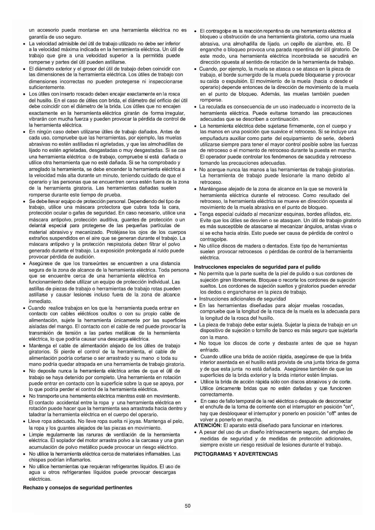 - No utilice discos de madera o dentados. Este tipo de herramientas suelen provocar retrocesos o pérdidas de control de la herramienta eléctrica. Instrucciones especiales de seguridad para el pulido