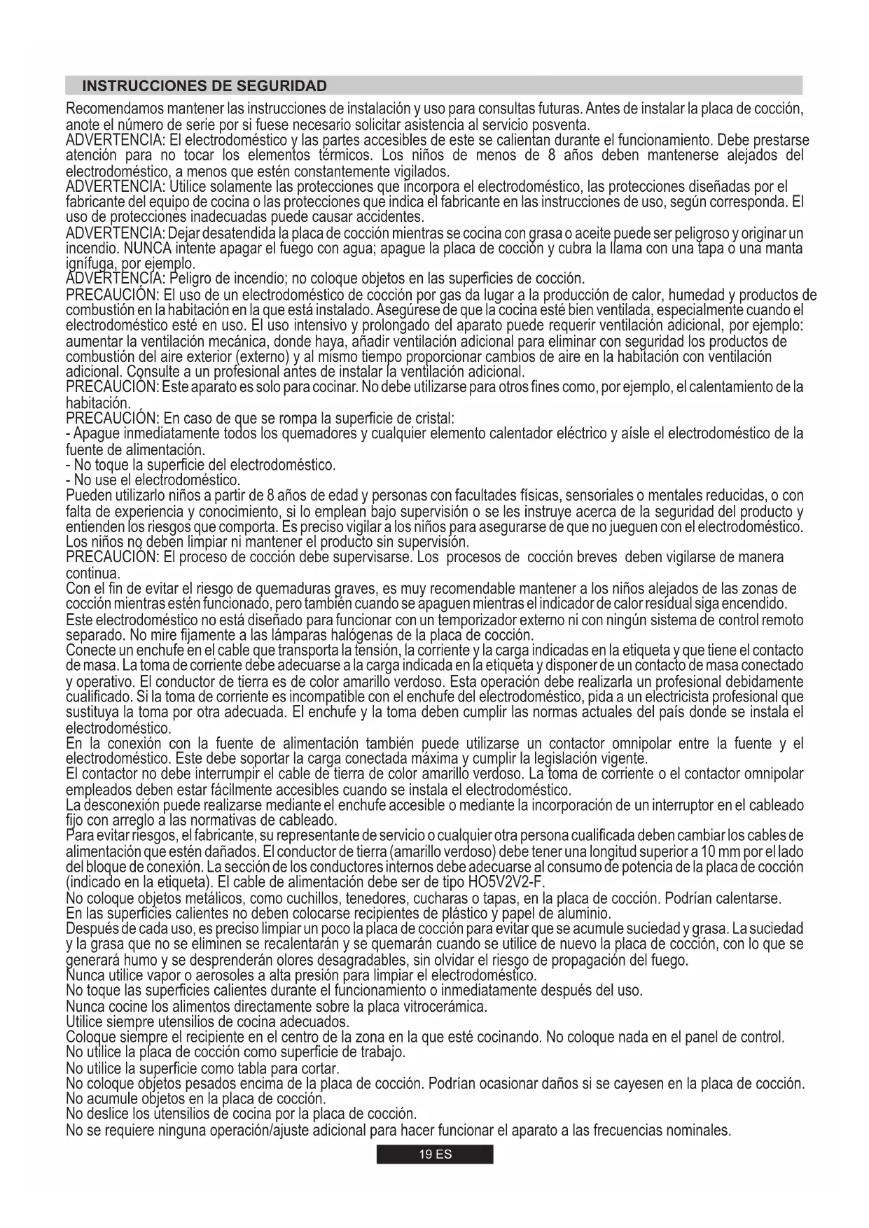 Decken Sie die Pfanne nach Möglichkeit mit einem Deckel ab. Stellen Sie die Flamme so ein, dass sie den Durchmesser der Pfanne nicht überdeckt.19 ES Recomendamos mantener las instrucciones de instalación y uso para consultas futuras. Antes de instalar la placa de cocción, anote el número de serie por si fuese necesario solicitar asistencia al servicio posventa. ADVERTENCIA: El electrodoméstico y las partes accesibles de este se calientan durante el funcionamiento. Debe prestarse atención para no tocar los elementos térmicos. Los niños de menos de 8 años deben mantenerse alejados del electrodoméstico, a menos que estén constantemente vigilados. ADVERTENCIA: Utilice solamente las protecciones que incorpora el electrodoméstico, las protecciones diseñadas por el fabricante del equipo de cocina o las protecciones que indica el fabricante en las instrucciones de uso, según corresponda. El uso de protecciones inadecuadas puede causar accidentes. ADVERTENCIA: Dejar desatendida la placa de cocción mientras se cocina con grasa o aceite puede ser peligroso y originar un incendio. NUNCA intente apagar el fuego con agua; apague la placa de cocción y cubra la llama con una tapa o una manta ignífuga, por ejemplo. ADVERTENCIA: Peligro de incendio; no coloque objetos en las superficies de cocción. PRECAUCIÓN: El uso de un electrodoméstico de cocción por gas da lugar a la producción de calor, humedad y productos de combustión en la habitación en la que está instalado. Asegúrese de que la cocina esté bien ventilada, especialmente cuando el electrodoméstico esté en uso. El uso intensivo y prolongado del aparato puede requerir ventilación adicional, por ejemplo: aumentar la ventilación mecánica, donde haya, añadir ventilación adicional para eliminar con seguridad los productos de combustión del aire exterior (externo) y al mismo tiempo proporcionar cambios de aire en la habitación con ventilación adicional. Consulte a un profesional antes de instalar la ventilación adicional. PRECAUCIÓN: Este aparato es solo para cocinar. No debe utilizarse para otros fines como, por ejemplo, el calentamiento de la habitación. PRECAUCIÓN: En caso de que se rompa la superficie de cristal: - Apague inmediatamente todos los quemadores y cualquier elemento calentador eléctrico y aísle el electrodoméstico de la fuente de alimentación. - No toque la superficie del electrodoméstico. - No use el electrodoméstico. Pueden utilizarlo niños a partir de 8 años de edad y personas con facultades físicas, sensoriales o mentales reducidas, o con falta de experiencia y conocimiento, si lo emplean bajo supervisión o se les instruye acerca de la seguridad del producto y entienden los riesgos que comporta. Es preciso vigilar a los niños para asegurarse de que no jueguen con el electrodoméstico. Los niños no deben limpiar ni mantener el producto sin supervisión. PRECAUCIÓN: El proceso de cocción debe supervisarse. Los procesos de cocción breves deben vigilarse de manera continua. Con el fin de evitar el riesgo de quemaduras graves, es muy recomendable mantener a los niños alejados de las zonas de cocción mientras estén funcionado, pero también cuando se apaguen mientras el indicador de calor residual siga encendido. Este electrodoméstico no está diseñado para funcionar con un temporizador externo ni con ningún sistema de control remoto separado. No mire fijamente a las lámparas halógenas de la placa de cocción. Conecte un enchufe en el cable que transporta la tensión, la corriente y la carga indicadas en la etiqueta y que tiene el contacto de masa. La toma de corriente debe adecuarse a la carga indicada en la etiqueta y disponer de un contacto de masa conectado y operativo. El conductor de tierra es de color amarillo verdoso. Esta operación debe realizarla un profesional debidamente cualificado. Si la toma de corriente es incompatible con el enchufe del electrodoméstico, pida a un electricista profesional que sustituya la toma por otra adecuada. El enchufe y la toma deben cumplir las normas actuales del país donde se instala el electrodoméstico. En la conexión con la fuente de alimentación también puede utilizarse un contactor omnipolar entre la fuente y el electrodoméstico. Este debe soportar la carga conectada máxima y cumplir la legislación vigente. El contactor no debe interrumpir el cable de tierra de color amarillo verdoso. La toma de corriente o el contactor omnipolar empleados deben estar fácilmente accesibles cuando se instala el electrodoméstico. La desconexión puede realizarse mediante el enchufe accesible o mediante la incorporación de un interruptor en el cableado fijo con arreglo a las normativas de cableado. Para evitar riesgos, el fabricante, su representante de servicio o cualquier otra persona cualificada deben cambiar los cables de alimentación que estén dañados. El conductor de tierra (amarillo verdoso) debe tener una longitud superior a 10 mm por el lado del bloque de conexión. La sección de los conductores internos debe adecuarse al consumo de potencia de la placa de cocción (indicado en la etiqueta). El cable de alimentación debe ser de tipo HO5V2V2-F. No coloque objetos metálicos, como cuchillos, tenedores, cucharas o tapas, en la placa de cocción. Podrían calentarse. En las superficies calientes no deben colocarse recipientes de plástico y papel de aluminio. Después de cada uso, es preciso limpiar un poco la placa de cocción para evitar que se acumule suciedad y grasa. La suciedad y la grasa que no se eliminen se recalentarán y se quemarán cuando se utilice de nuevo la placa de cocción, con lo que se generará humo y se desprenderán olores desagradables, sin olvidar el riesgo de propagación del fuego. Nunca utilice vapor o aerosoles a alta presión para limpiar el electrodoméstico. No toque las superficies calientes durante el funcionamiento o inmediatamente después del uso. Nunca cocine los alimentos directamente sobr