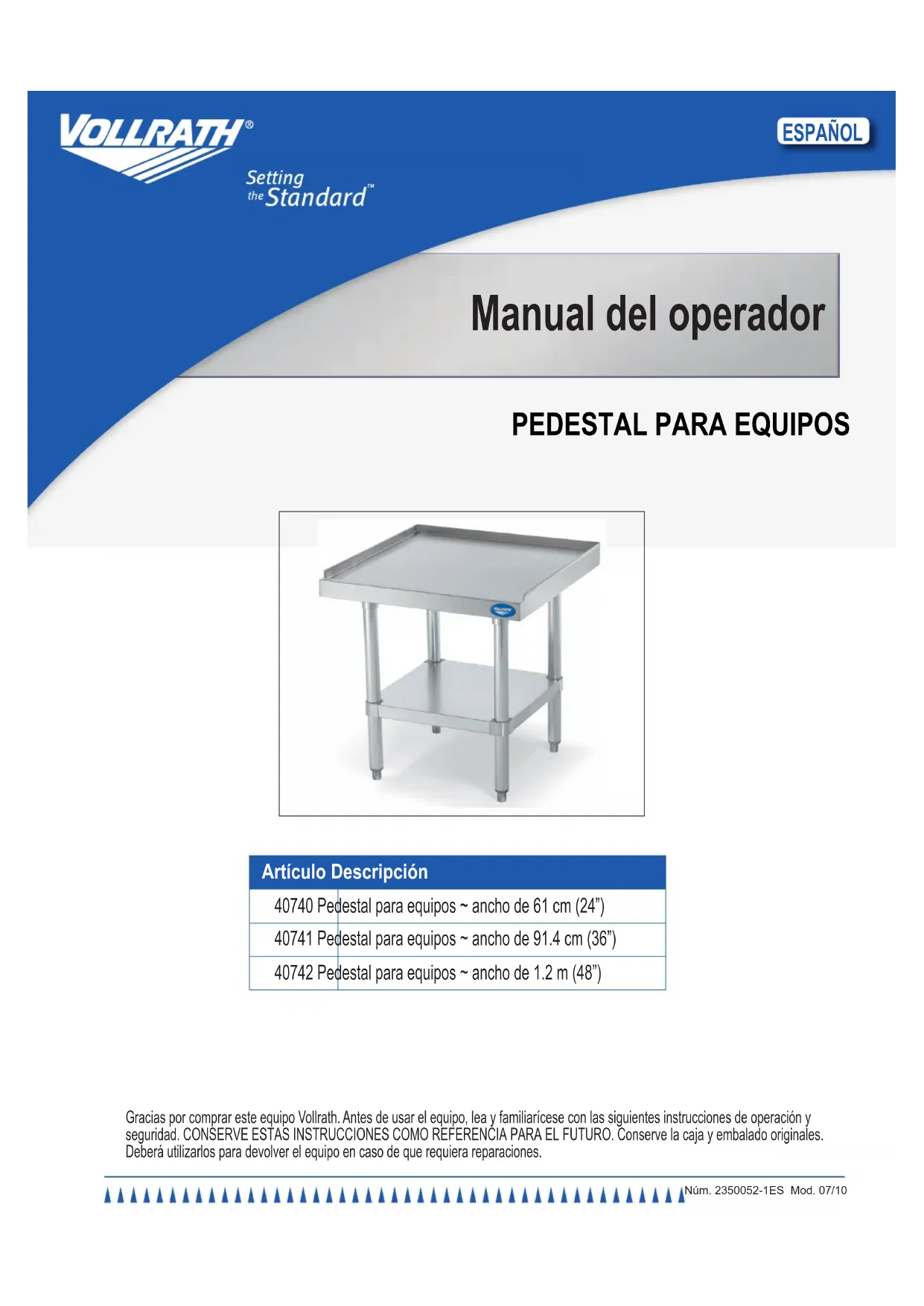 Gracias por comprar este equipo Vollrath. Antes de usar el equipo, lea y familiarícese con las siguientes instrucciones de operación y seguridad. CONSERVE ESTAS INSTRUCCIONES COMO REFERENCIA PARA EL FUTURO. Conserve la caja y embalado originales. Deberá utilizarlos para devolver el equipo en caso de que requiera reparaciones. ESPAÑOL Artículo Descripción 40740 Pedestal para equipos ~ ancho de 61 cm (24”) 40741 Pedestal para equipos ~ ancho de 91.4 cm (36”) 40742 Pedestal para equipos ~ ancho de 1.2 m (48”)Equipos dE sobrEmEsa para cocinar Manual del operador