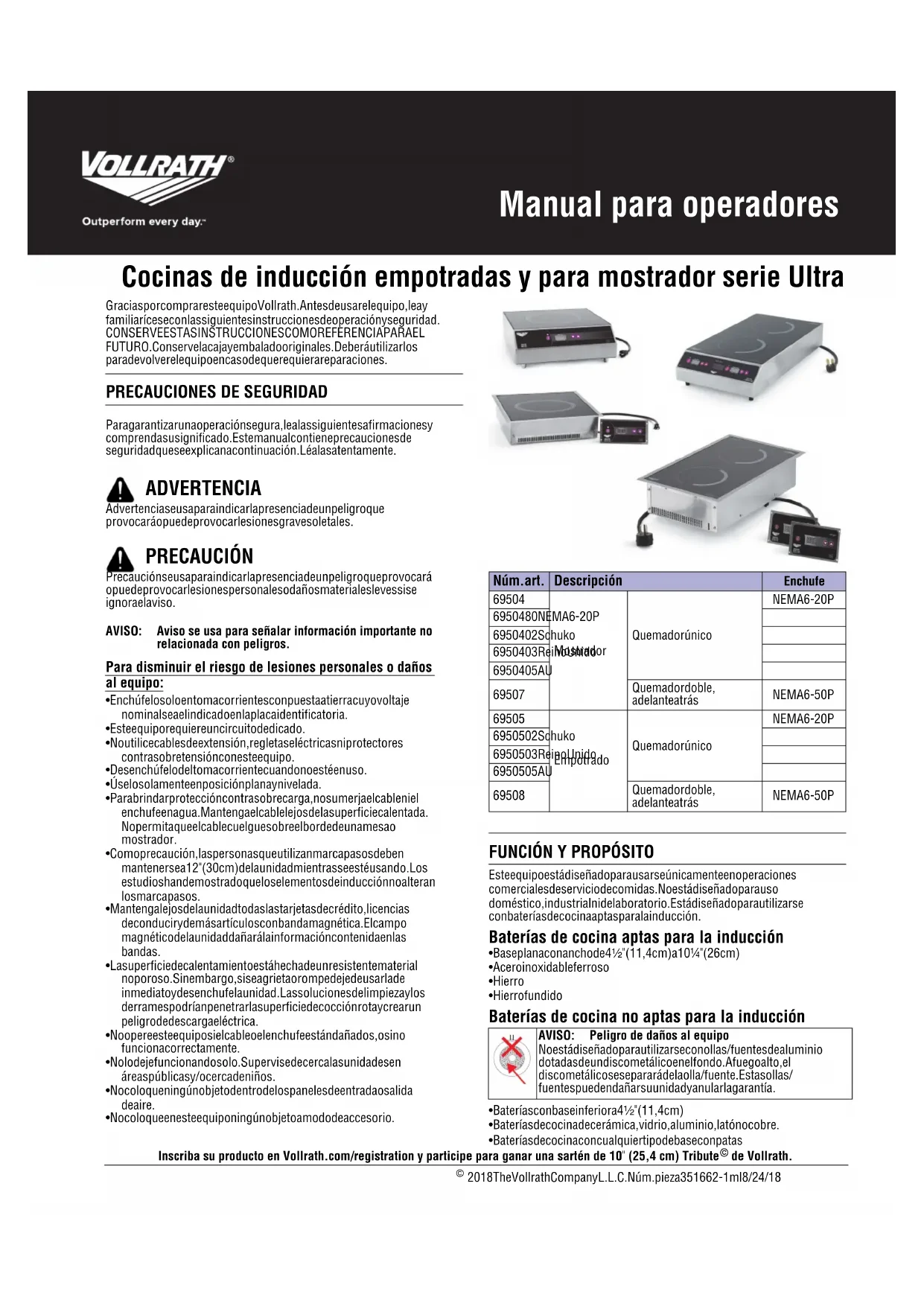 - Baterías con base inferior a 4¹⁄₂" (11,4 cm)• Baterías de cocina de cerámica, vidrio, aluminio, latón o cobre.• Baterías de cocina con cualquier tipo de base con patas ADVERTENCIA PRECAUCIÓN Núm.art. Descripción Enchufe69504MostradorQuemador únicoNEMA 6-20P6950480 NEMA 6-20P6950402 Schuko6950403 Reino Unido6950405 AU69507Quemador doble,adelante atrásNEMA 6-50P69505EmpotradoQuemador únicoNEMA 6-20P6950502 Schuko6950503 Reino Unido6950505 AU69508Quemador doble,adelante atrásNEMA 6-50P AVISO: Peligro de daños al equipo No está diseñado para utilizarse con ollas/fuentes de aluminiodotadas de un disco metálico en el fondo. A fuego alto, eldisco metálico se separará de la olla/fuente. Estas ollas/fuentes pueden dañar su unidad y anular la garantía.2 Cocinas de inducción empotradas y para mostrador serie Ultra Manual para operadores