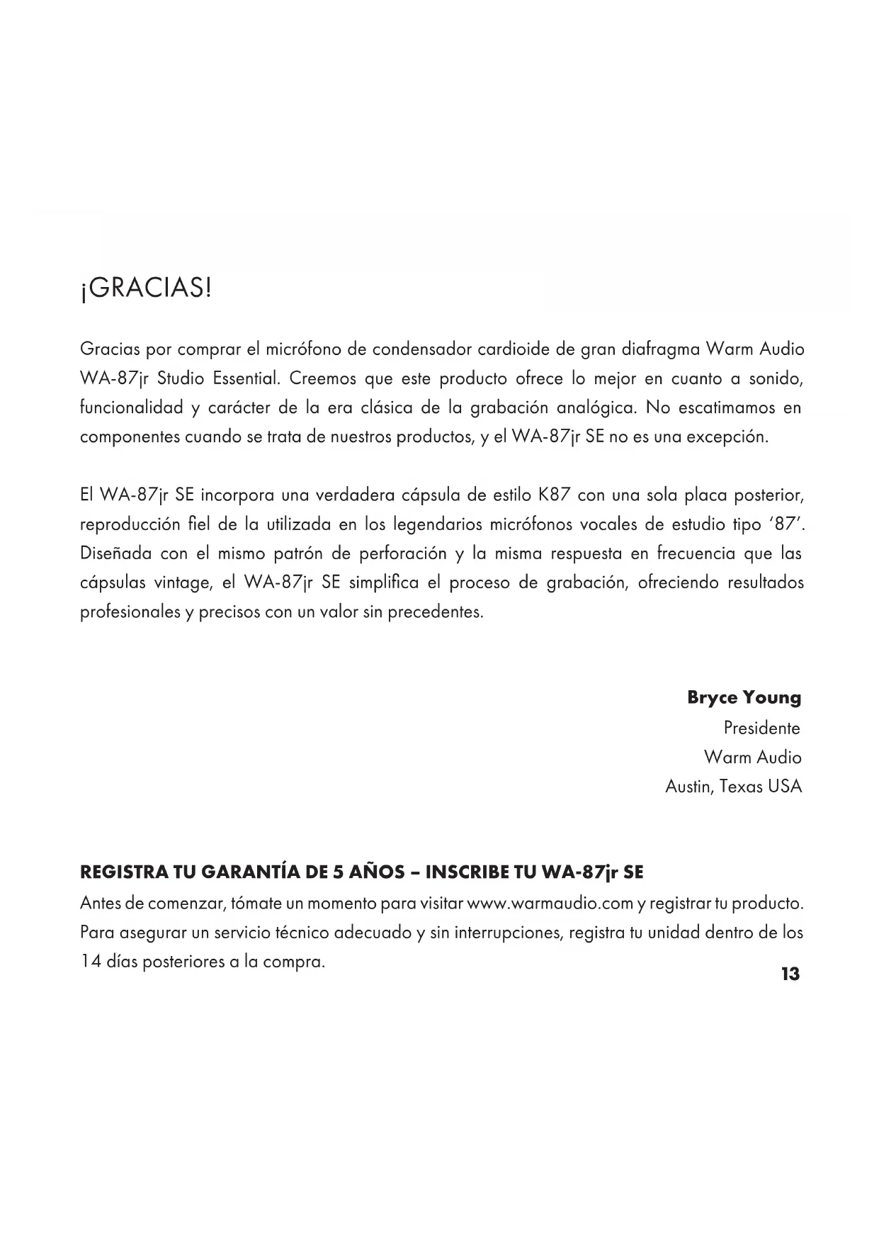 - Sensibilité : 10 mV/Pa ou -40 dB11 ¡GRACIAS! Gracias por adquirir el micrófono de condensador Warm Audio WA-87jr de gran diafragma sin transformador. Creemos que este producto ofrece lo mejor en cuanto a sonido, funcionalidad y carácter de la era clásica de la grabación analógica. No escatimamos en la calidad de los componentes que utilizamos, y el WA-87jr no es la excepción. El WA-87jr presenta una reproducción fiel de la cápsula estilo K87 vintage, como la que se utilizaba en los clásicos micró- fonos de estudio vocal tipo ‘87. Diseñada con el mismo patrón de perforación y respuesta en frecuencia que las cápsulas vintage, el WA-87jr añade un circuito moderno sin transformador para ofrecer un tono legendario en un formato altamente asequible. Con un pad de -10 dB, filtro de paso alto a 70 Hz y 3 patrones polares seleccionables, el WA-87jr proporciona un sonido atemporal, flexibilidad profesional y un valor sin precedentes. Bryce Young Presidente Warm Audio Austin, Texas, États-Unis ACTIVA TU GARANTÍA DE 5 AÑOS - REGISTRA TU WA-87jr Antes de comenzar, tómate un momento para visitar www.warmaudio.com y registrar tu producto. Para asegurar una co- bertura de garantía adecuada e ininterrumpida, registra tu unidad dentro de los 14 días posteriores a la compra.12