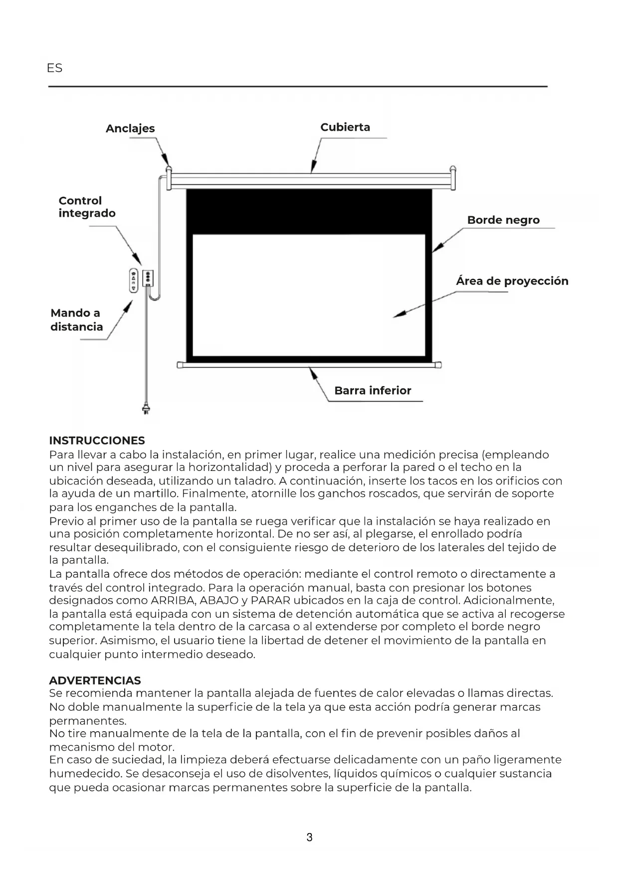 21ES INSTRUCCIONES Para llevar a cabo la instalación, en primer lugar, realice una medición precisa (empleando un nivel para asegurar la horizontalidad) y proceda a perforar la pared o el techo en la ubicación deseada, utilizando un taladro. A continuación, inserte los tacos en los orificios con la ayuda de un martillo. Finalmente, atornille los ganchos roscados, que servirán de soporte para los enganches de la pantalla. Previo al primer uso de la pantalla se ruega verificar que la instalación se haya realizado en una posición completamente horizontal. De no ser así, al plegarse, el enrollado podría resultar desequilibrado, con el consiguiente riesgo de deterioro de los laterales del tejido de la pantalla. La pantalla ofrece dos métodos de operación: mediante el control remoto o directamente a través del control integrado. Para la operación manual, basta con presionar los botones designados como ARRIBA, ABAJO y PARAR ubicados en la caja de control. Adicionalmente, la pantalla está equipada con un sistema de detención automática que se activa al recogerse completamente la tela dentro de la carcasa o al extenderse por completo el borde negro superior. Asimismo, el usuario tiene la libertad de detener el movimiento de la pantalla en cualquier punto intermedio deseado. ADVERTENCIAS Se recomienda mantener la pantalla alejada de fuentes de calor elevadas o llamas directas. No doble manualmente la superficie de la tela ya que esta acción podría generar marcas permanentes. No tire manualmente de la tela de la pantalla, con el fin de prevenir posibles daños al mecanismo del motor. En caso de suciedad, la limpieza deberá efectuarse delicadamente con un paño ligeramente humedecido. Se desaconseja el uso de disolventes, líquidos químicos o cualquier sustancia que pueda ocasionar marcas permanentes sobre la superficie de la pantalla. Anclajes Cubierta Borde negro Área de proyección Barra inferior Control integrado Mando a distancia 3Controlador Remoto de Electromotor Instala el diagrama esquemático Diagrama esquemático de cableado Alternador Color del cable de subida: Marrón Color del cable del medio: Azul Color del cable de bajada: Negro Color del cable de tierra: Amarillo con verde