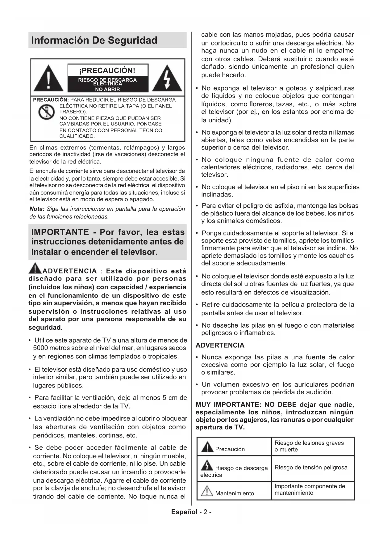 - Un volumen excesivo en los auriculares podrían provocar problemas de pérdida de audición. MUY IMPORTANTE: NO DEBE dejar que nadie, especialmente los niños, introduzcan ningún objeto por los agujeros, las ranuras o por cualquier apertura de TV. Precaución Riesgo de lesiones graves o muerte Riesgo de descarga eléctricaRiesgo de tensión peligrosa Mantenimiento Importante componente de mantenimientoEspañol - 3 - Marcas en el producto Los siguientes símbolos se utilizan como marcadores sobre las restricciones, precauciones e instrucciones